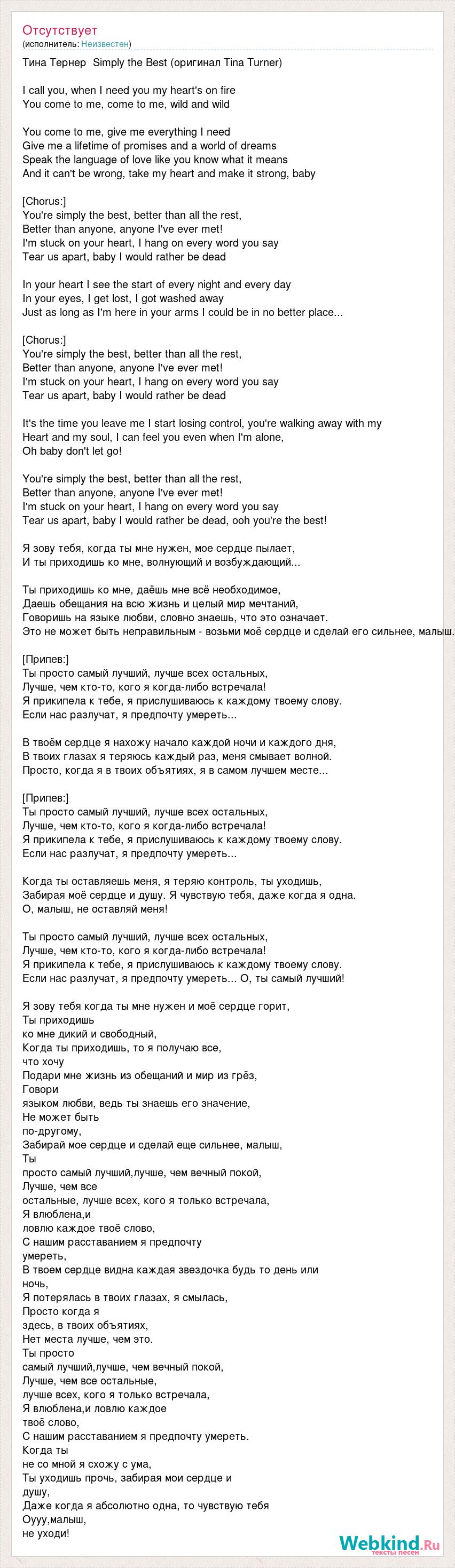 Тина Тернер Simply the Best (оригинал Tina Turner) I call you, when I need you my heart's on fire You come to me, come to me, wild and wild You come to me, give me everything I need Give me a lifetime of promises and a world of dreams Speak the language of love like you know what it means And it can't be wrong, take my heart and make it strong, baby [Chorus:] You're simply the best, better than all the rest, Better than anyone, anyone I've ever met! I'm stuck on your heart, I hang on every word you say Tear us apart, baby I would rather be dead In your heart I see the start of every night and every day In your eyes, I get lost, I got washed away Just as long as I'm here in your arms I could be in no better place... [Chorus:] You're simply the best, better than all the rest, Better than anyone, anyone I've ever met! I'm stuck on your heart, I hang on every word you say Tear us apart, baby I would rather be dead It's the time you leave me I start losing control, you're walking away with my Heart and my soul, I can feel you even when I'm alone, Oh baby don't let go! You're simply the best, better than all the rest, Better than anyone, anyone I've ever met! I'm stuck on your heart, I hang on every word you say Tear us apart, baby I would rather be dead, ooh you're the best! Я зову тебя, когда ты мне нужен, мое сердце пылает, И ты приходишь ко мне, волнующий и возбуждающий... Ты приходишь ко мне, даёшь мне всё необходимое, Даешь обещания на всю жизнь и целый мир мечтаний, Говоришь на языке любви, словно знаешь, что это означает. Это не может быть неправильным - возьми моё сердце и сделай его сильнее, малыш. [Припев:] Ты просто самый лучший, лучше всех остальных, Лучше, чем кто-то, кого я когда-либо встречала! Я прикипела к тебе, я прислушиваюсь к каждому твоему слову. Если нас разлучат, я предпочту умереть... В твоём сердце я нахожу начало каждой ночи и каждого дня, В твоих глазах я теряюсь каждый раз, меня смывает волной. Просто, когда я в твоих объятиях, я в самом лучшем месте... [Припев:] Ты просто самый лучший, лучше всех остальных, Лучше, чем кто-то, кого я когда-либо встречала! Я прикипела к тебе, я прислушиваюсь к каждому твоему слову. Если нас разлучат, я предпочту умереть... Когда ты оставляешь меня, я теряю контроль, ты уходишь, Забирая моё сердце и душу. Я чувствую тебя, даже когда я одна. О, малыш, не оставляй меня! Ты просто самый лучший, лучше всех остальных, Лучше, чем кто-то, кого я когда-либо встречала! Я прикипела к тебе, я прислушиваюсь к каждому твоему слову. Если нас разлучат, я предпочту умереть... О, ты самый лучший! Я зову тебя когда ты мне нужен и моё сердце горит, Ты приходишь ко мне дикий и свободный, Когда ты приходишь, то я получаю все, что хочу Подари мне жизнь из обещаний и мир из грёз, Говори языком любви, ведь ты знаешь его значение, Не может быть по-другому, Забирай мое сердце и сделай еще сильнее, малыш, Ты просто самый лучший,лучше, чем вечный покой, Лучше, чем все остальные, лучше всех, кого я только встречала, Я влюблена,и ловлю каждое твоё слово, С нашим расставанием я предпочту умереть, В твоем сердце видна каждая звездочка будь то день или ночь, Я потерялась в твоих глазах, я смылась, Просто когда я здесь, в твоих объятиях, Нет места лучше, чем это. Ты просто самый лучший,лучше, чем вечный покой, Лучше, чем все остальные, лучше всех, кого я только встречала, Я влюблена,и ловлю каждое твоё слово, С нашим расставанием я предпочту умереть. Когда ты не со мной я схожу с ума, Ты уходишь прочь, забирая мои сердце и душу, Даже когда я абсолютно одна, то чувствую тебя Оууу,малыш, не уходи!