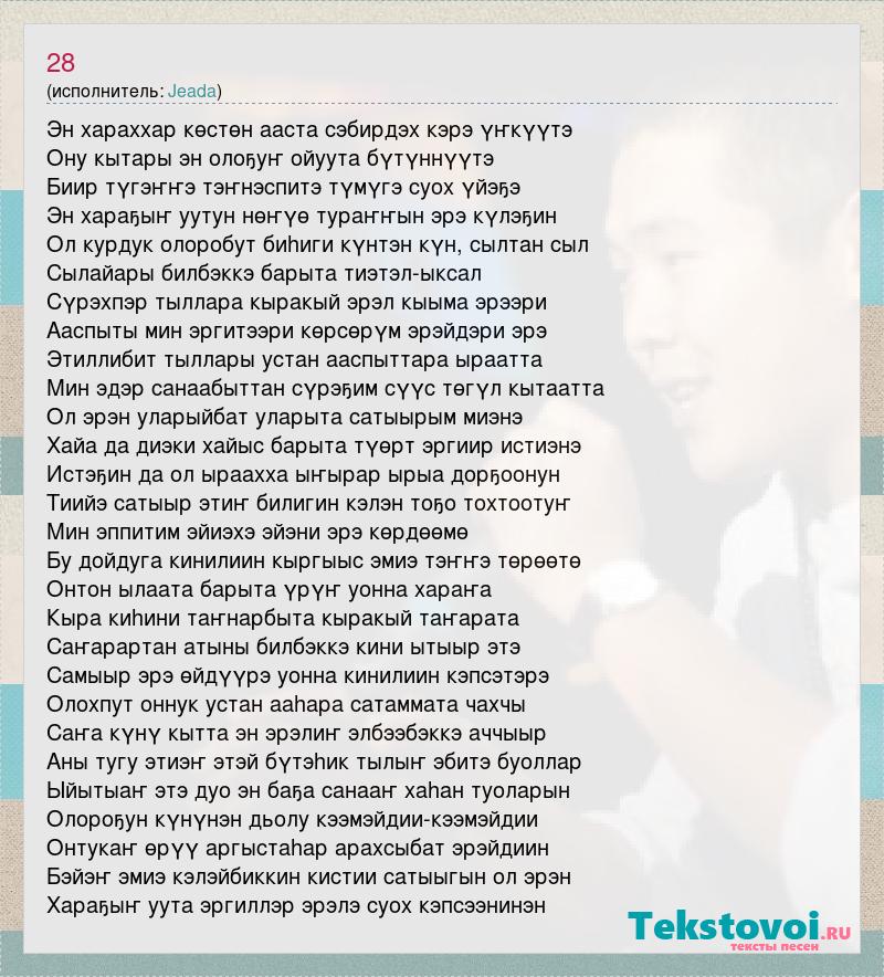 Эн хараххар көстөн ааста сэбирдэх кэрэ үҥкүүтэ Ону кытары эн олоҕуҥ ойуута бүтүннүүтэ Биир түгэҥҥэ тэҥнэспитэ түмүгэ суох үйэҕэ Эн хараҕыҥ уутун нөҥүө тураҥҥын эрэ күлэҕин Ол курдук олоробут биhиги күнтэн күн, сылтан сыл Сылайары билбэккэ барыта тиэтэл-ыксал Сүрэхпэр тыллара кыракый эрэл кыыма эрээри Ааспыты мин эргитээри көрсөрүм эрэйдэри эрэ Этиллибит тыллары устан ааспыттара ыраатта Мин эдэр санаабыттан сүрэҕим сүүс төгүл кытаатта Ол эрэн уларыйбат уларыта сатыырым миэнэ Хайа да диэки хайыс барыта түөрт эргиир истиэнэ Истэҕин да ол ыраахха ыҥырар ырыа дорҕоонун Тиийэ сатыыр этиҥ билигин кэлэн тоҕо тохтоотуҥ Мин эппитим эйиэхэ эйэни эрэ көрдөөмө Бу дойдуга кинилиин кыргыыс эмиэ тэҥҥэ төрөөтө Онтон ылаата барыта үрүҥ уонна хараҥа Кыра киhини таҥнарбыта кыракый таҥарата Саҥарартан атыны билбэккэ кини ытыыр этэ Самыыр эрэ өйдүүрэ уонна кинилиин кэпсэтэрэ Олохпут оннук устан ааhара сатаммата чахчы Саҥа күнү кытта эн эрэлиҥ элбээбэккэ аччыыр Аны тугу этиэҥ этэй бүтэhик тылыҥ эбитэ буоллар Ыйытыаҥ этэ дуо эн баҕа санааҥ хаhан туоларын Олороҕун күнүнэн дьолу кээмэйдии-кээмэйдии Онтукаҥ өрүү аргыстаhар арахсыбат эрэйдиин Бэйэҥ эмиэ кэлэйбиккин кистии сатыыгын ол эрэн Хараҕыҥ уута эргиллэр эрэлэ суох кэпсээнинэн