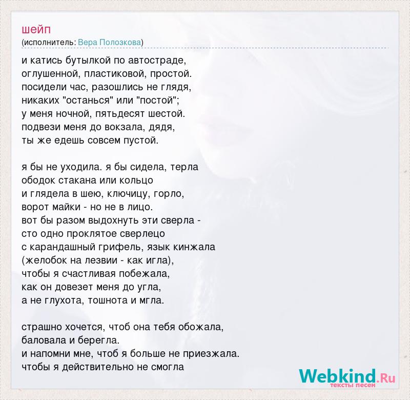 Вера Николаевна Полозкова (5 марта 1986, Москва) — русская поэтесса, актриса.Родилась в Москве 5 марта 1986 года. С 1993 по 2000 год училась в московской школе № 1243. Класс Б, специализация: углубленное изучение английского языка. Экстерном закончила два последних класса средней школы. Стихи пишет с 9 лет. Первую книгу опубликовала в 15 лет. Стала одним из самых юных «тысячников» на Livejournal.com.... подробнее
