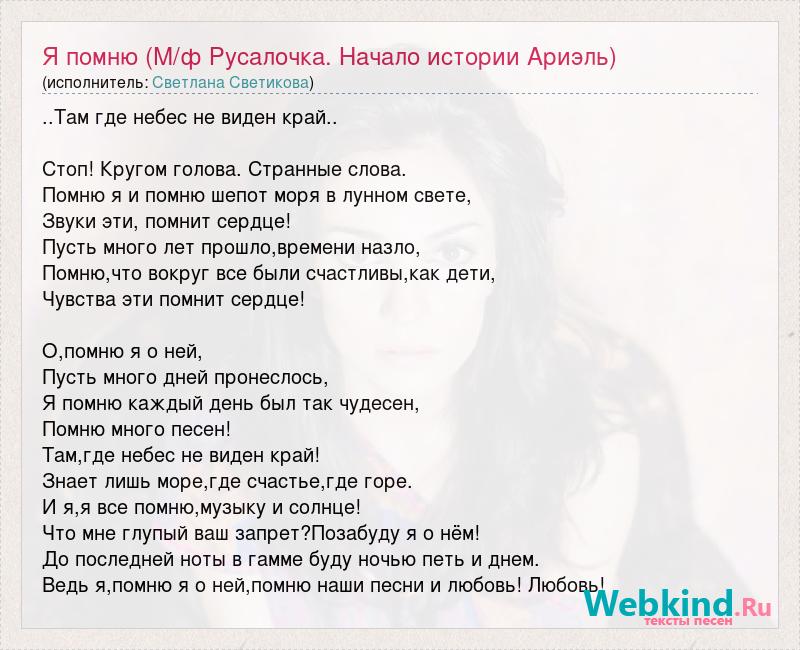 ..Там где небес не виден край.. Стоп! Кругом голова. Странные слова. Помню я и помню шепот моря в лунном свете, Звуки эти, помнит сердце! Пусть много лет прошло,времени назло, Помню,что вокруг все были счастливы,как дети, Чувства эти помнит сердце! О,помню я о ней, Пусть много дней пронеслось, Я помню каждый день был так чудесен, Помню много песен! Там,где небес не виден край! Знает лишь море,где счастье,где горе. И я,я все помню,музыку и солнце! Что мне глупый ваш запрет?Позабуду я о нём! До последней ноты в гамме буду ночью петь и днем. Ведь я,помню я о ней,помню наши песни и любовь! Любовь!