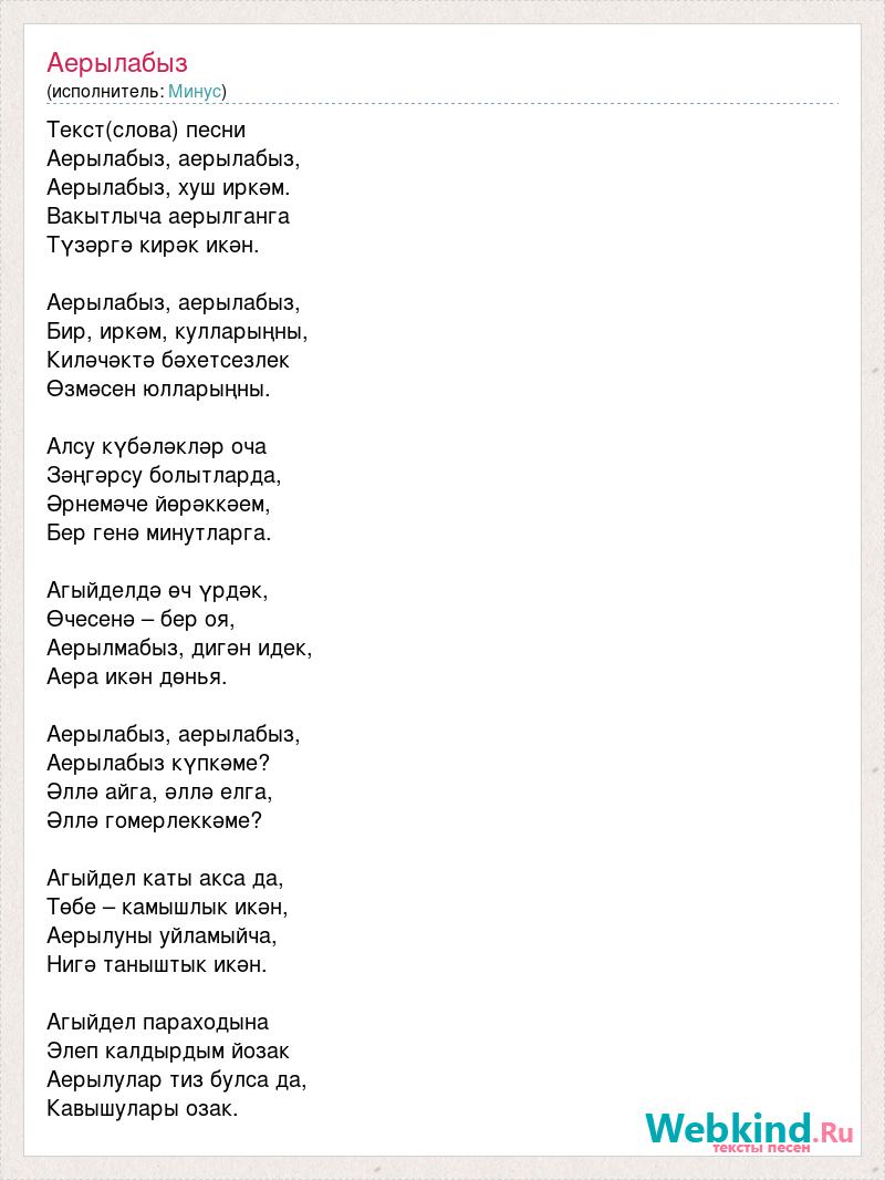 Текст(слова) песни Аерылабыз, аерылабыз, Аерылабыз, хуш иркәм. Вакытлыча аерылганга Түзәргә кирәк икән. Аерылабыз, аерылабыз, Бир, иркәм, кулларыңны, Киләчәктә бәхетсезлек Өзмәсен юлларыңны. Алсу күбәләкләр оча Зәңгәрсу болытларда, Әрнемәче йөрәккәем, Бер генә минутларга. Агыйделдә өч үрдәк, Өчесенә – бер оя, Аерылмабыз, дигән идек, Аера икән дөнья. Аерылабыз, аерылабыз, Аерылабыз күпкәме? Әллә айга, әллә елга, Әллә гомерлеккәме? Агыйдел каты акса да, Төбе – камышлык икән, Аерылуны уйламыйча, Нигә таныштык икән. Агыйдел параходына Элеп калдырдым йозак Аерылулар тиз булса да, Кавышулары озак.