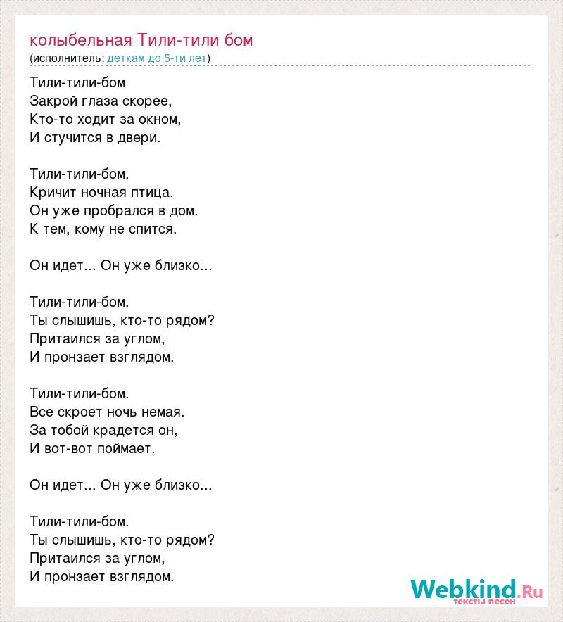 Тили-тили-бом Закрой глаза скорее, Кто-то ходит за окном, И стучится в двери. Тили-тили-бом. Кричит ночная птица. Он уже пробрался в дом. К тем, кому не спится. Он идет... Он уже близко... Тили-тили-бом. Ты слышишь, кто-то рядом? Притаился за углом, И пронзает взглядом. Тили-тили-бом. Все скроет ночь немая. За тобой крадется он, И вот-вот поймает. Он идет... Он уже близко... Тили-тили-бом. Ты слышишь, кто-то рядом? Притаился за углом, И пронзает взглядом.
