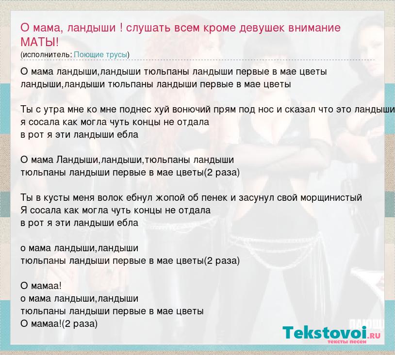 О мама ландыши,ландыши тюльпаны ландыши первые в мае цветы ландыши,ландыши тюльпаны ландыши первые в мае цветы Ты с утра мне ко мне поднес хуй вонючий прям под нос и сказал что это ландыши я сосала как могла чуть концы не отдала в рот я эти ландыши ебла О мама Ландыши,ландыши,тюльпаны ландыши тюльпаны ландыши первые в мае цветы(2 раза) Ты в кусты меня волок ебнул жопой об пенек и засунул свой морщинистый Я сосала как могла чуть концы не отдала в рот я эти ландыши ебла о мама ландыши,ландыши тюльпаны ландыши первые в мае цветы(2 раза) О мамаа! о мама ландыши,ландыши тюльпаны ландыши первые в мае цветы О мамаа!(2 раза)