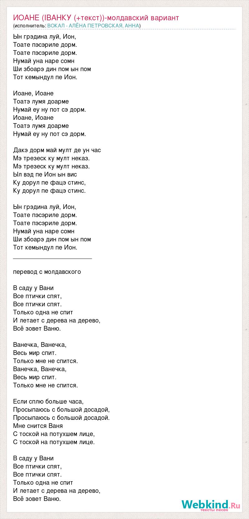 Ын грэдина луй, Ион, Тоате пэсэриле дорм. Тоате пэсэриле дорм. Нумай уна наре сомн Ши збоарэ дин пом ын пом Тот кемындул пе Ион. Иоане, Иоане Тоатэ лумя доарме Нумай еу ну пот сэ дорм. Иоане, Иоане Тоатэ лумя доарме Нумай еу ну пот сэ дорм. Дакэ дорм май мулт де ун час Мэ трезеск ку мулт неказ. Мэ трезеск ку мулт неказ. Ыл вэд пе Ион ын вис Ку дорул пе фацэ стинс, Ку дорул пе фацэ стинс. Ын грэдина луй, Ион, Тоате пэсэриле дорм. Тоате пэсэриле дорм. Нумай уна наре сомн Ши збоарэ дин пом ын пом Тот кемындул пе Ион. _______________________ перевод с молдавского В саду у Вани Все птички спят, Все птички спят. Только одна не спит И летает с дерева на дерево, Всё зовет Ваню. Ванечка, Ванечка, Весь мир спит. Только мне не спится. Ванечка, Ванечка, Весь мир спит. Только мне не спится. Если сплю больше часа, Просыпаюсь с большой досадой, Просыпаюсь с большой досадой. Мне снится Ваня С тоской на потухшем лице, С тоской на потухшем лице. В саду у Вани Все птички спят, Все птички спят. Только одна не спит И летает с дерева на дерево, Всё зовет Ваню.