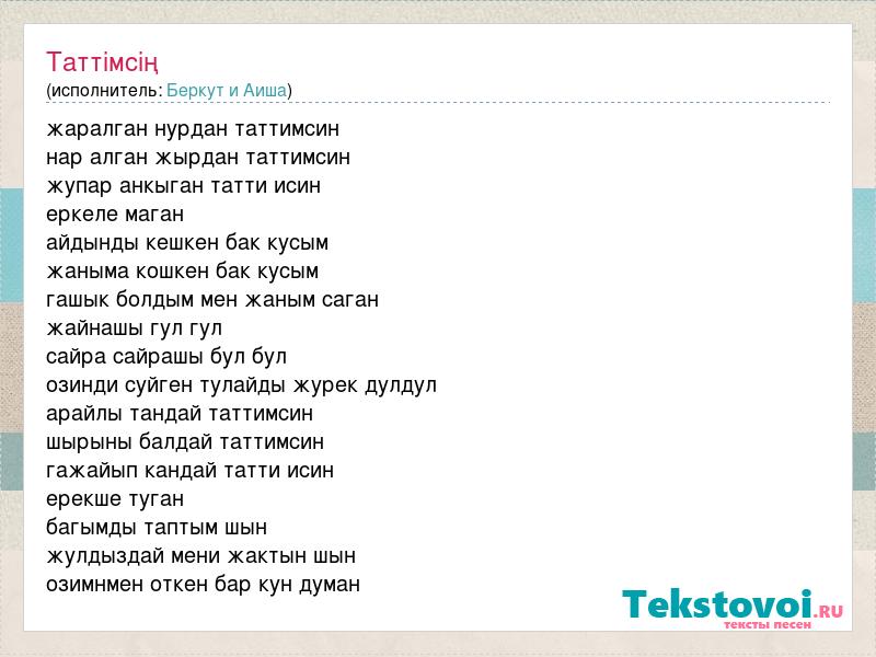 жаралган нурдан таттимсин нар алган жырдан таттимсин жупар анкыган татти исин еркеле маган айдынды кешкен бак кусым жаныма кошкен бак кусым гашык болдым мен жаным саган жайнашы гул гул сайра сайрашы бул бул озинди суйген тулайды журек дулдул арайлы тандай таттимсин шырыны балдай таттимсин гажайып кандай татти исин ерекше туган багымды таптым шын жулдыздай мени жактын шын озимнмен откен бар кун думан