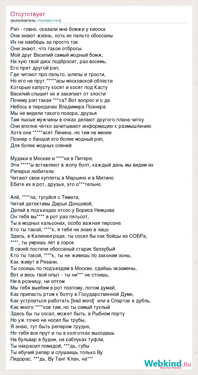 Рэп - говно, сказали мне бомжи у киоска Они знают жизнь, хоть их пальто обоссаны Их не наебёшь за просто так Они знают, что такое отбросы Мой друг Василий самый модный бомж, На хую твой диск подбросит, раз восемь, Его прет другой рэп, Где читают про пальто, шляпы и трости, Но его не прут *****асы московской области Которые капусту косят и косят под Касту Василий слышит их и закипает от злости Почему рэп такая ***та? Вот вопрос и о да Небось в передачах Владимира Познера Мы не видели такого позора, друзья Там лысые мужчины в очках делают другого плана читку Они вполне четко зачитывают информацию к размышлению Хотя они *****асят Ленина, но тем не менее Познер с бандой это более модный рэп, Для более модных оленей Мудаки в Москве и ****ки в Питере, Эти *****ы вставляют в жопу болт, каждый день мы видим их Рэперки любители Читают свои куплеты в Марьино и в Митино Ебите их в рот, друзья, это о***тельно Алё, ****ла, тусуйся с Тимати, Читай детективы Дарьи Донцовой, Делай в подъездах отсос у Бориса Немцова Он тебя вы**** в рот раз пятьсот, Ты в модных кальсонах, особо важная персона Кто ты такой, ****к, я тебя не знаю в лицо Здесь, в Калининграде, ты сосал бы как бойцы из СОБРа, ****, ты умрешь лет в сорок В своей постели обоссаный старик беззубый Кто ты такой, ****к, ты не живешь по законам зоны, Как живут в Рязани, Ты сосешь по подъездам в Москве, сдаёшь экзамены, Вот и весь твой опыт - ты ни*** не стоишь, Ни в розницу, ни оптом Мы тебя выебем в рот поэтому, потом думай, Как припасть ртом к болту в Государственной Думе, Как устроиться работать [bad word] или в Спартак в дубль, Как много ****ков там, но ты самый тухлый Здесь бы ты сосал, может быть, в Рыбном порту Но уж точно не носил бы трубы, Я знаю, тут быть репером трудно, Но тебя все прут и ты в колготках выходишь На бульвар в будни, на каблуках туфли, Ты накрасил помадой, ***дь, губы Ты ебучий репер и слушаешь только Ву Пидорас, ***дь, Ву Танг Клан, на***