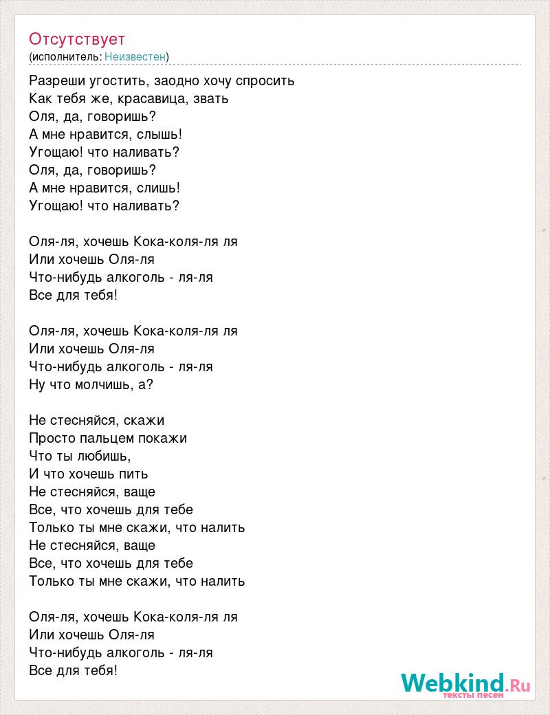 Разреши угостить, заодно хочу спросить Как тебя же, красавица, звать Оля, да, говоришь? А мне нравится, слышь! Угощаю! что наливать? Оля, да, говоришь? А мне нравится, слишь! Угощаю! что наливать? Оля-ля, хочешь Кока-коля-ля ля Или хочешь Оля-ля Что-нибудь алкоголь - ля-ля Все для тебя! Оля-ля, хочешь Кока-коля-ля ля Или хочешь Оля-ля Что-нибудь алкоголь - ля-ля Ну что молчишь, а? Не стесняйся, скажи Просто пальцем покажи Что ты любишь, И что хочешь пить Не стесняйся, ваще Все, что хочешь для тебе Только ты мне скажи, что налить Не стесняйся, ваще Все, что хочешь для тебе Только ты мне скажи, что налить Оля-ля, хочешь Кока-коля-ля ля Или хочешь Оля-ля Что-нибудь алкоголь - ля-ля Все для тебя!
