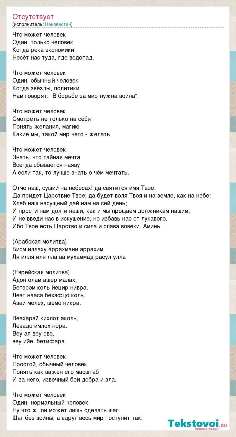 Что может человек Один, только человек Когда река экономики Несёт нас туда, где водопад. Что может человек Один, обычный человек Когда звёзды, политики Нам говорят: "В борьбе за мир нужна война". Что может человек Смотреть не только на себя Понять желания, магию Какие мы, такой мир чего - желать. Что может человек Знать, что тайная мечта Всегда сбывается наяву А если так, то лучше знать о чём мечтать. Отче наш, сущий на небесах! да святится имя Твое; Да придет Царствие Твое; да будет воля Твоя и на земле, как на небе; Хлеб наш насущный дай нам на сей день; И прости нам долги наши, как и мы прощаем должникам нашим; И не введи нас в искушение, но избавь нас от лукавого. Ибо Твое есть Царство и сила и слава вовеки. Аминь. (Арабская молитва) Бисм иллаху аррахмани аррахим Ля илля иля лла ва мухаммад расул улла (Еврейская молитва) Адон олам ашер малах, Бетэрэм коль йецир нивра. Леэт нааса бехэфцо коль, Азай мелех, шемо никра. Веахарэй кихлот аколь, Левадо имлох нора. Веу ая веу овэ, веу ийе, бетифара Что может человек Простой, обычный человек Понять как важен его масштаб И за него, извечный бой добра и зла. Что может человек Один, нормальный человек Ну что ж, он может лишь сделать шаг Шаг без войны, а вдруг весь мир поступит так.