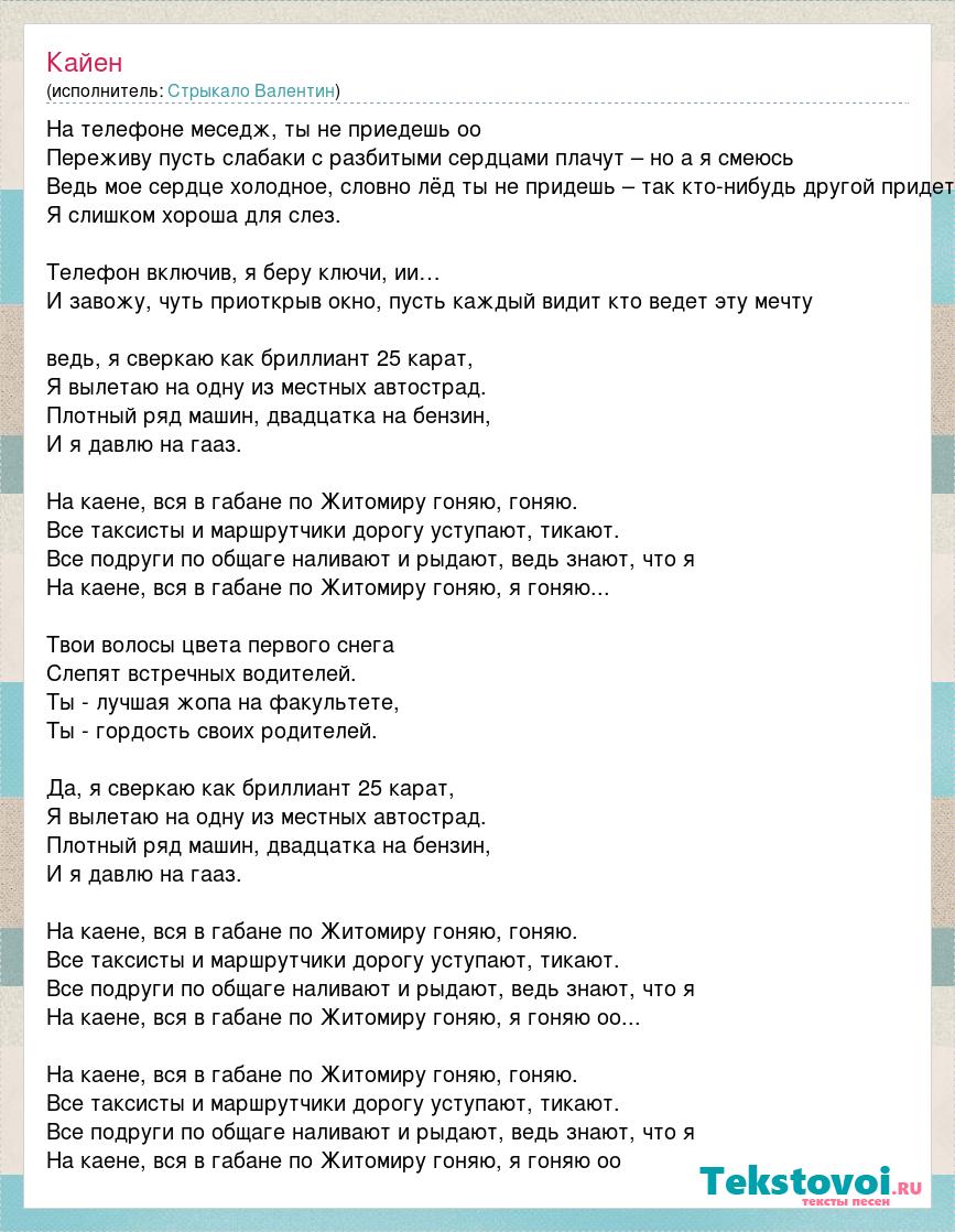 На телефоне меседж, ты не приедешь оо Переживу пусть слабаки с разбитыми сердцами плачут – но а я смеюсь Ведь мое сердце холодное, словно лёд ты не придешь – так кто-нибудь другой придет Я слишком хороша для слез. Телефон включив, я беру ключи, ии… И завожу, чуть приоткрыв окно, пусть каждый видит кто ведет эту мечту ведь, я сверкаю как бриллиант 25 карат, Я вылетаю на одну из местных автострад. Плотный ряд машин, двадцатка на бензин, И я давлю на гааз. На каене, вся в габане по Житомиру гоняю, гоняю. Все таксисты и маршрутчики дорогу уступают, тикают. Все подруги по общаге наливают и рыдают, ведь знают, что я На каене, вся в габане по Житомиру гоняю, я гоняю... Твои волосы цвета первого снега Слепят встречных водителей. Ты - лучшая жопа на факультете, Ты - гордость своих родителей. Да, я сверкаю как бриллиант 25 карат, Я вылетаю на одну из местных автострад. Плотный ряд машин, двадцатка на бензин, И я давлю на гааз. На каене, вся в габане по Житомиру гоняю, гоняю. Все таксисты и маршрутчики дорогу уступают, тикают. Все подруги по общаге наливают и рыдают, ведь знают, что я На каене, вся в габане по Житомиру гоняю, я гоняю оо... На каене, вся в габане по Житомиру гоняю, гоняю. Все таксисты и маршрутчики дорогу уступают, тикают. Все подруги по общаге наливают и рыдают, ведь знают, что я На каене, вся в габане по Житомиру гоняю, я гоняю оо