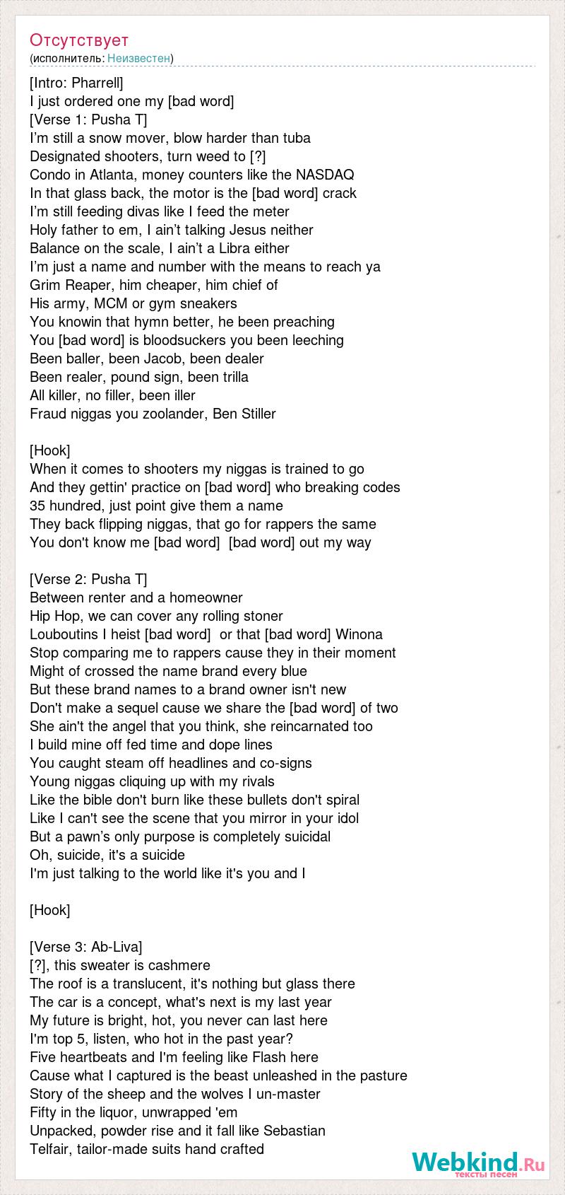 [Intro: Pharrell] I just ordered one my [bad word] [Verse 1: Pusha T] I’m still a snow mover, blow harder than tuba Designated shooters, turn weed to [?] Condo in Atlanta, money counters like the NASDAQ In that glass back, the motor is the [bad word] crack I’m still feeding divas like I feed the meter Holy father to em, I ain’t talking Jesus neither Balance on the scale, I ain’t a Libra either I’m just a name and number with the means to reach ya Grim Reaper, him cheaper, him chief of His army, MCM or gym sneakers You knowin that hymn better, he been preaching You [bad word] is bloodsuckers you been leeching Been baller, been Jacob, been dealer Been realer, pound sign, been trilla All killer, no filler, been iller Fraud niggas you zoolander, Ben Stiller [Hook] When it comes to shooters my niggas is trained to go And they gettin' practice on [bad word] who breaking codes 35 hundred, just point give them a name They back flipping niggas, that go for rappers the same You don't know me [bad word] [bad word] out my way [Verse 2: Pusha T] Between renter and a homeowner Hip Hop, we can cover any rolling stoner Louboutins I heist [bad word] or that [bad word] Winona Stop comparing me to rappers cause they in their moment Might of crossed the name brand every blue But these brand names to a brand owner isn't new Don't make a sequel cause we share the [bad word] of two She ain't the angel that you think, she reincarnated too I build mine off fed time and dope lines You caught steam off headlines and co-signs Young niggas cliquing up with my rivals Like the bible don't burn like these bullets don't spiral Like I can't see the scene that you mirror in your idol But a pawn’s only purpose is completely suicidal Oh, suicide, it's a suicide I'm just talking to the world like it's you and I [Hook] [Verse 3: Ab-Liva] [?], this sweater is cashmere The roof is a translucent, it's nothing but glass there The car is a concept, what's next is my last year My future is bright, hot, you never can last here I'm top 5, listen, who hot in the past year? Five heartbeats and I'm feeling like Flash here Cause what I captured is the beast unleashed in the pasture Story of the sheep and the wolves I un-master Fifty in the liquor, unwrapped 'em Unpacked, powder rise and it fall like Sebastian Telfair, tailor-made suits hand crafted