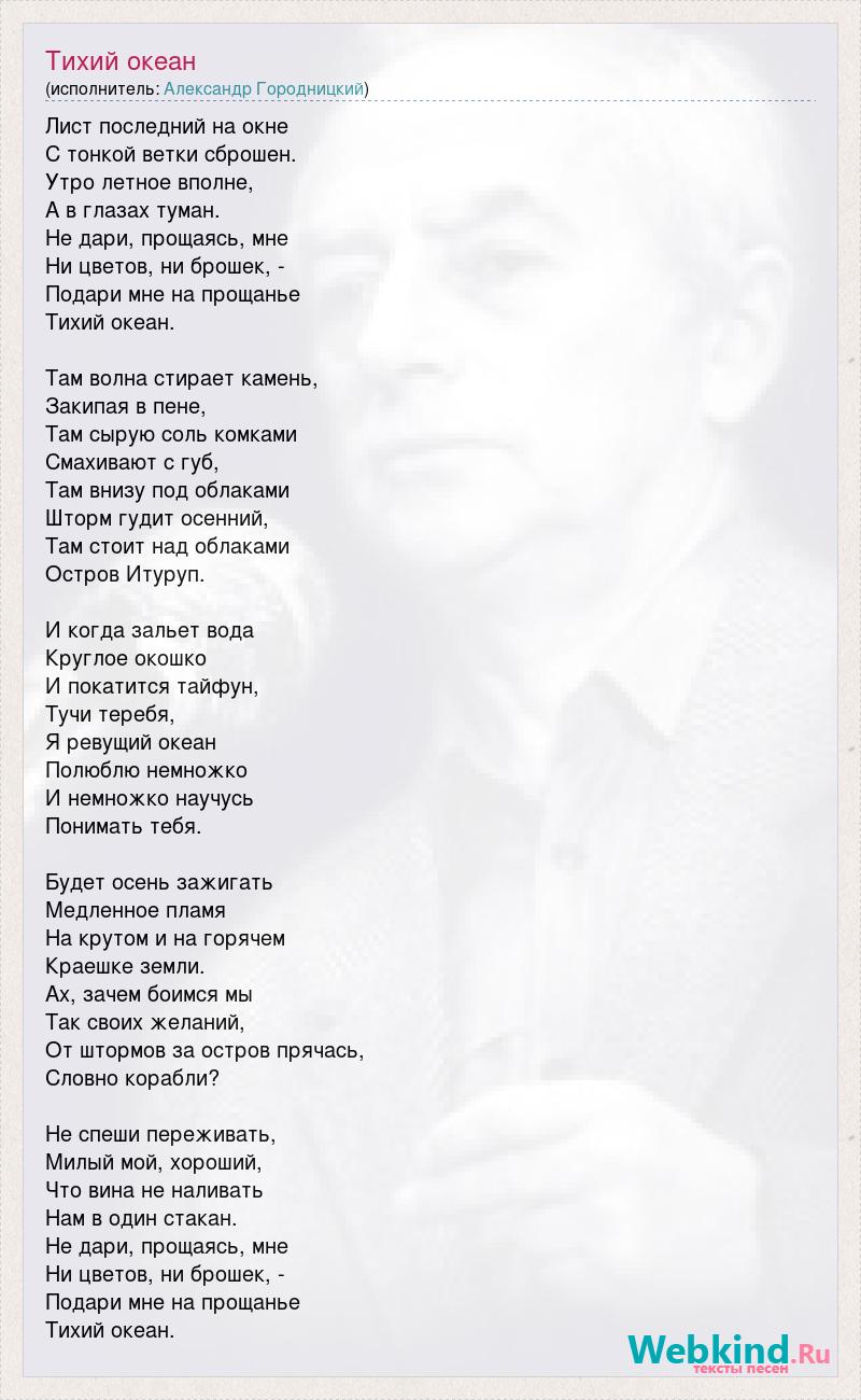 Лист последний на окне С тонкой ветки сброшен. Утро летное вполне, А в глазах туман. Не дари, прощаясь, мне Ни цветов, ни брошек, - Подари мне на прощанье Тихий океан. Там волна стирает камень, Закипая в пене, Там сырую соль комками Смахивают с губ, Там внизу под облаками Шторм гудит осенний, Там стоит над облаками Остров Итуруп. И когда зальет вода Круглое окошко И покатится тайфун, Тучи теребя, Я ревущий океан Полюблю немножко И немножко научусь Понимать тебя. Будет осень зажигать Медленное пламя На крутом и на горячем Краешке земли. Ах, зачем боимся мы Так своих желаний, От штормов за остров прячась, Словно корабли? Не спеши переживать, Милый мой, хороший, Что вина не наливать Нам в один стакан. Не дари, прощаясь, мне Ни цветов, ни брошек, - Подари мне на прощанье Тихий океан.