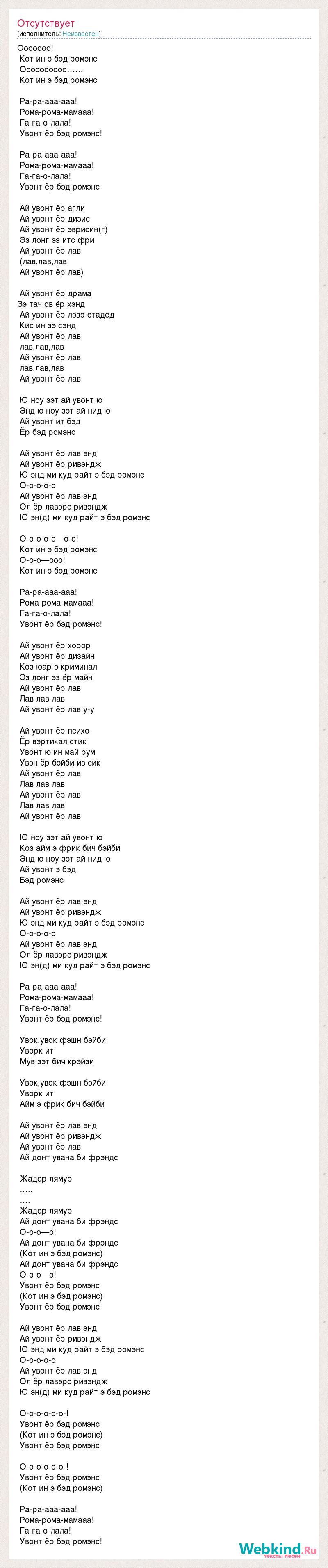 Ооооооо! Кот ин э бэд ромэнс Оооооооооо…… Кот ин э бэд ромэнс Ра-ра-ааа-ааа! Рома-рома-мамааа! Га-га-о-лала! Увонт ёр бэд ромэнс! Ра-ра-ааа-ааа! Рома-рома-мамааа! Га-га-о-лала! Увонт ёр бэд ромэнс Ай увонт ёр агли Ай увонт ёр дизис Ай увонт ёр эврисин(г) Эз лонг эз итс фри Ай увонт ёр лав (лав,лав,лав Ай увонт ёр лав) Ай увонт ёр драма Зэ тач ов ёр хэнд Ай увонт ёр лэзэ-стадед Кис ин зэ сэнд Ай увонт ёр лав лав,лав,лав Ай увонт ёр лав лав,лав,лав Ай увонт ёр лав Ю ноу зэт ай увонт ю Энд ю ноу зэт ай нид ю Ай увонт ит бэд Ёр бэд ромэнс Ай увонт ёр лав энд Ай увонт ёр ривэндж Ю энд ми куд райт э бэд ромэнс О-о-о-о-о Ай увонт ёр лав энд Ол ёр лавэрс ривэндж Ю эн(д) ми куд райт э бэд ромэнс О-о-о-о-о—о-о! Кот ин э бэд ромэнс О-о-о—ооо! Кот ин э бэд ромэнс Ра-ра-ааа-ааа! Рома-рома-мамааа! Га-га-о-лала! Увонт ёр бэд ромэнс! Ай увонт ёр хорор Ай увонт ёр дизайн Коз юар э криминал Эз лонг эз ёр майн Ай увонт ёр лав Лав лав лав Ай увонт ёр лав у-у Ай увонт ёр психо Ёр вэртикал стик Увонт ю ин май рум Увэн ёр бэйби из сик Ай увонт ёр лав Лав лав лав Ай увонт ёр лав Лав лав лав Ай увонт ёр лав Ю ноу зэт ай увонт ю Коз айм э фрик бич бэйби Энд ю ноу зэт ай нид ю Ай увонт э бэд Бэд ромэнс Ай увонт ёр лав энд Ай увонт ёр ривэндж Ю энд ми куд райт э бэд ромэнс О-о-о-о-о Ай увонт ёр лав энд Ол ёр лавэрс ривэндж Ю эн(д) ми куд райт э бэд ромэнс Ра-ра-ааа-ааа! Рома-рома-мамааа! Га-га-о-лала! Увонт ёр бэд ромэнс! Увок,увок фэшн бэйби Уворк ит Мув зэт бич крэйзи Увок,увок фэшн бэйби Уворк ит Айм э фрик бич бэйби Ай увонт ёр лав энд Ай увонт ёр ривэндж Ай увонт ёр лав Ай донт увана би фрэндс Жадор лямур ….. …. Жадор лямур Ай донт увана би фрэндс О-о-о—о! Ай донт увана би фрэндс (Кот ин э бэд ромэнс) Ай донт увана би фрэндс О-о-о—о! Увонт ёр бэд ромэнс (Кот ин э бэд ромэнс) Увонт ёр бэд ромэнс Ай увонт ёр лав энд Ай увонт ёр ривэндж Ю энд ми куд райт э бэд ромэнс О-о-о-о-о Ай увонт ёр лав энд Ол ёр лавэрс ривэндж Ю эн(д) ми куд райт э бэд ромэнс О-о-о-о-о-о-! Увонт ёр бэд ромэнс (Кот ин э бэд ромэнс) Увонт ёр бэд ромэнс О-о-о-о-о-о-! Увонт ёр бэд ромэнс (Кот ин э бэд ромэнс) Ра-ра-ааа-ааа! Рома-рома-мамааа! Га-га-о-лала! Увонт ёр бэд ромэнс!