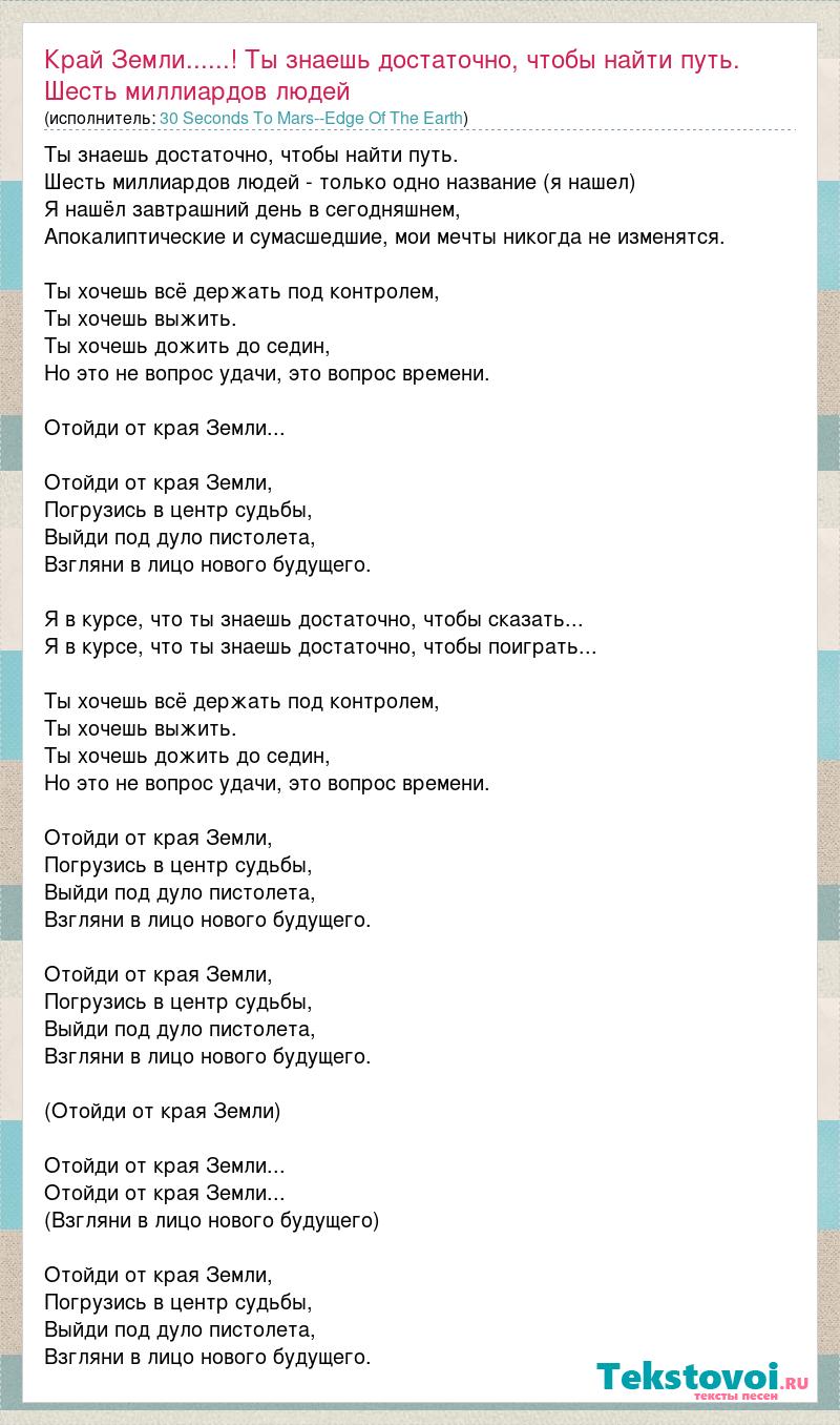 Главная→Исполнители→30 Seconds To Mars--Edge Of The Earth→Край Земли......! Ты знаешь достаточно, чтобы найти путь. Шесть миллиардов лю