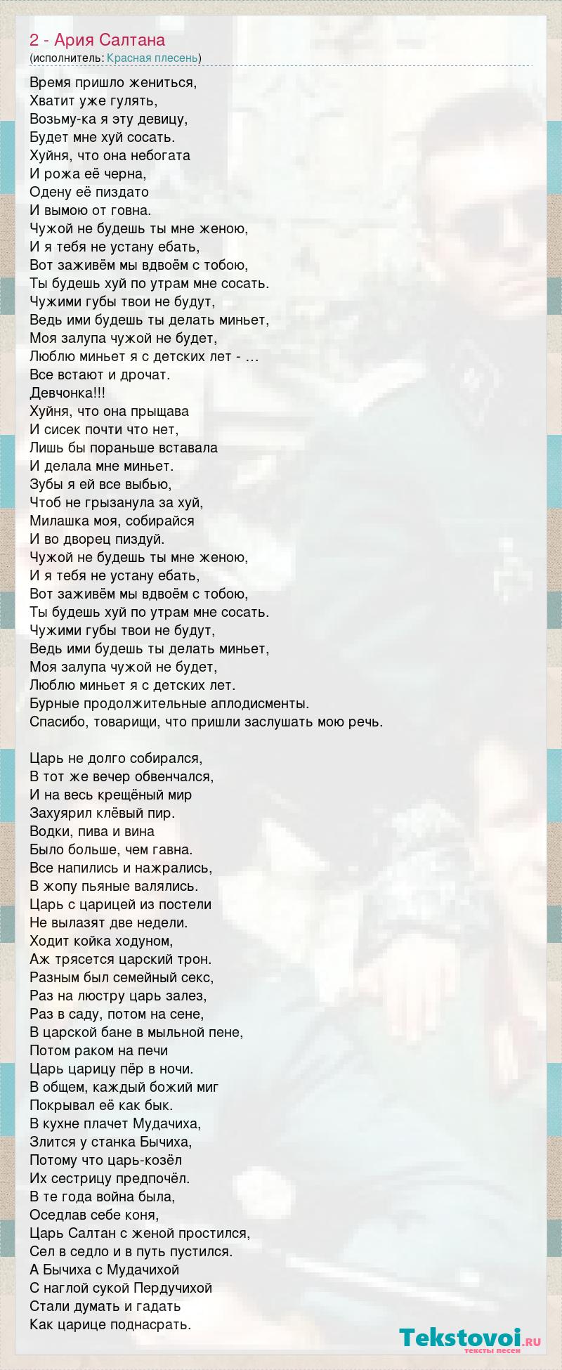 Время пришло жениться, Хватит уже гулять, Возьму-ка я эту девицу, Будет мне хуй сосать. Хуйня, что она небогата И рожа её черна, Одену её пиздато И вымою от говна. Чужой не будешь ты мне женою, И я тебя не устану ебать, Вот заживём мы вдвоём с тобою, Ты будешь хуй по утрам мне сосать. Чужими губы твои не будут, Ведь ими будешь ты делать миньет, Моя залупа чужой не будет, Люблю миньет я с детских лет - … Все встают и дрочат. Девчонка!!! Хуйня, что она прыщава И сисек почти что нет, Лишь бы пораньше вставала И делала мне миньет. Зубы я ей все выбью, Чтоб не грызанула за хуй, Милашка моя, собирайся И во дворец пиздуй. Чужой не будешь ты мне женою, И я тебя не устану ебать, Вот заживём мы вдвоём с тобою, Ты будешь хуй по утрам мне сосать. Чужими губы твои не будут, Ведь ими будешь ты делать миньет, Моя залупа чужой не будет, Люблю миньет я с детских лет. Бурные продолжительные аплодисменты. Спасибо, товарищи, что пришли заслушать мою речь. Царь не долго собирался, В тот же вечер обвенчался, И на весь крещёный мир Захуярил клёвый пир. Водки, пива и вина Было больше, чем гавна. Все напились и нажрались, В жопу пьяные валялись. Царь с царицей из постели Не вылазят две недели. Ходит койка ходуном, Аж трясется царский трон. Разным был семейный секс, Раз на люстру царь залез, Раз в саду, потом на сене, В царской бане в мыльной пене, Потом раком на печи Царь царицу пёр в ночи. В общем, каждый божий миг Покрывал её как бык. В кухне плачет Мудачиха, Злится у станка Бычиха, Потому что царь-козёл Их сестрицу предпочёл. В те года война была, Оседлав себе коня, Царь Салтан с женой простился, Сел в седло и в путь пустился. А Бычиха с Мудачихой С наглой сукой Пердучихой Стали думать и гадать Как царице поднасрать.