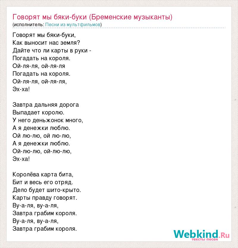 Говорят мы бяки-буки, Как выносит нас земля? Дайте что ли карты в руки - Погадать на короля. Ой-ля-ля, ой-ля-ля Погадать на короля. Ой-ля-ля, ой-ля-ля, Эх-ха! Завтра дальняя дорога Выпадает королю. У него деньжонок много, А я денежки люблю. Ой лю-лю, ой лю-лю, А я денежки люблю. Ой-лю-лю, ой-лю-лю, Эх-ха! Королёва карта бита, Бит и весь его отряд. Дело будет шито-крыто. Карты правду говорят. Ву-а-ля, ву-а-ля, Завтра грабим короля. Ву-а-ля, ву-а-ля, Завтра грабим короля.