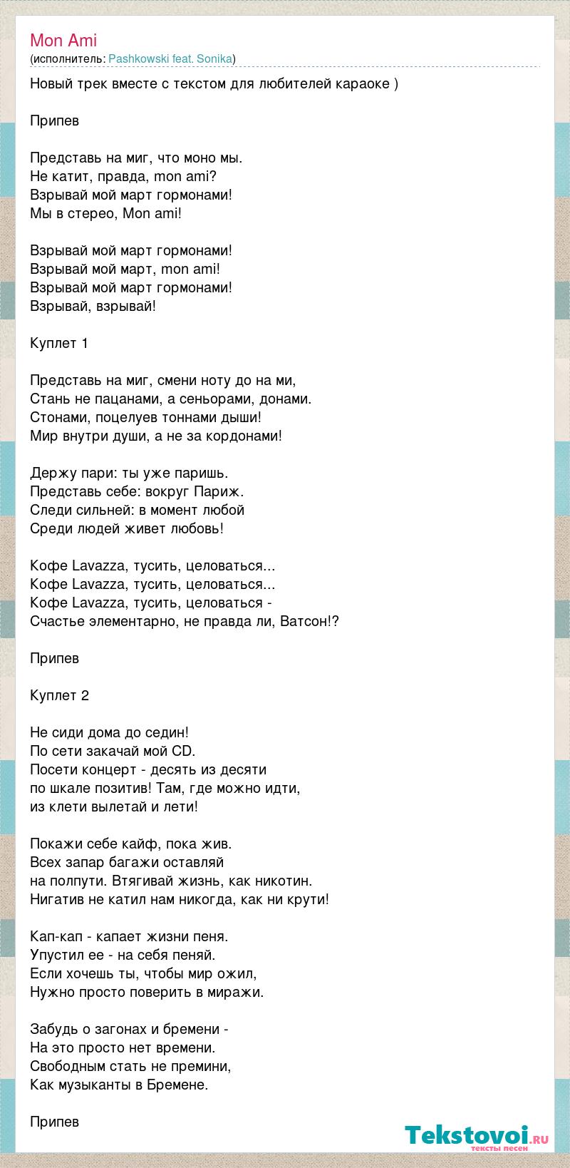 Новый трек вместе с текстом для любителей караоке ) Припев Представь на миг, что моно мы. Не катит, правда, mon ami? Взрывай мой март гормонами! Мы в стерео, Mon ami! Взрывай мой март гормонами! Взрывай мой март, mon ami! Взрывай мой март гормонами! Взрывай, взрывай! Куплет 1 Представь на миг, смени ноту до на ми, Стань не пацанами, а сеньорами, донами. Стонами, поцелуев тоннами дыши! Мир внутри души, а не за кордонами! Держу пари: ты уже паришь. Представь себе: вокруг Париж. Следи сильней: в момент любой Среди людей живет любовь! Кофе Lavazza, тусить, целоваться... Кофе Lavazza, тусить, целоваться... Кофе Lavazza, тусить, целоваться - Счастье элементарно, не правда ли, Ватсон!? Припев Куплет 2 Не сиди дома до седин! По сети закачай мой CD. Посети концерт - десять из десяти по шкале позитив! Там, где можно идти, из клети вылетай и лети! Покажи себе кайф, пока жив. Всех запар багажи оставляй на полпути. Втягивай жизнь, как никотин. Нигатив не катил нам никогда, как ни крути! Кап-кап - капает жизни пеня. Упустил ее - на себя пеняй. Если хочешь ты, чтобы мир ожил, Нужно просто поверить в миражи. Забудь о загонах и бремени - На это просто нет времени. Свободным стать не премини, Как музыканты в Бремене. Припев