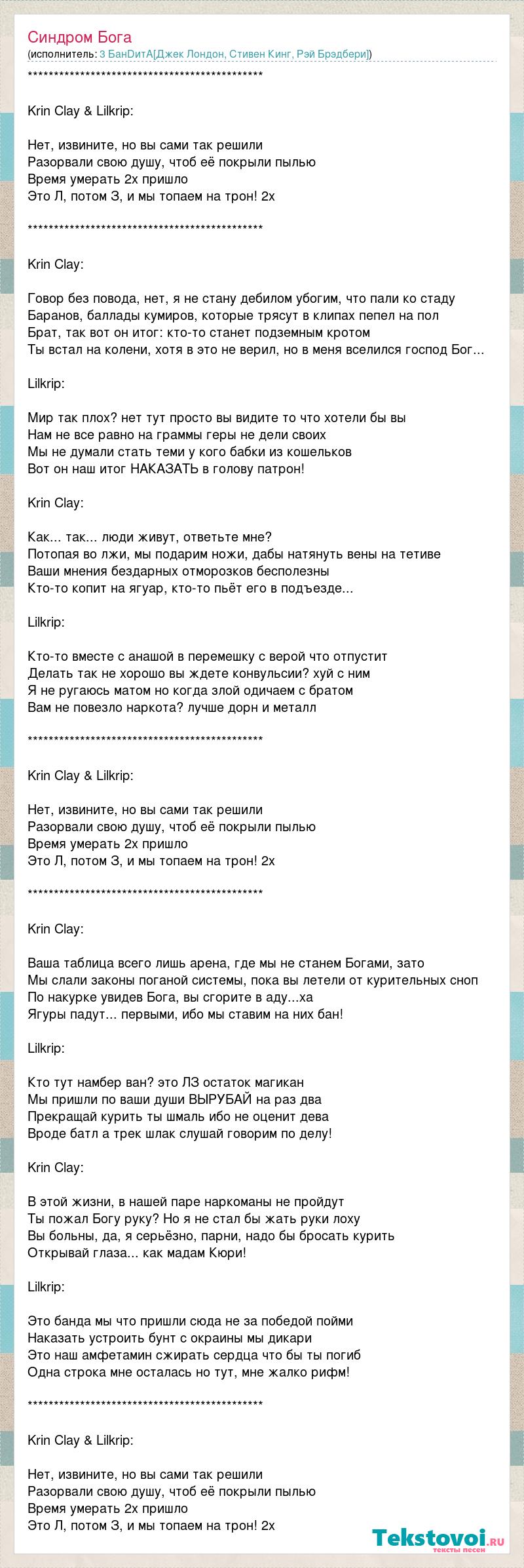 ********************************************* Krin Clay & Lilkrip: Нет, извините, но вы сами так решили Разорвали свою душу, чтоб её покрыли пылью Время умерать 2x пришло Это Л, потом З, и мы топаем на трон! 2x ********************************************* Krin Clay: Говор без повода, нет, я не стану дебилом убогим, что пали ко стаду Баранов, баллады кумиров, которые трясут в клипах пепел на пол Брат, так вот он итог: кто-то станет подземным кротом Ты встал на колени, хотя в это не верил, но в меня вселился господ Бог... Lilkrip: Мир так плох? нет тут просто вы видите то что хотели бы вы Нам не все равно на граммы геры не дели своих Мы не думали стать теми у кого бабки из кошельков Вот он наш итог НАКАЗАТЬ в голову патрон! Krin Clay: Как... так... люди живут, ответьте мне? Потопая во лжи, мы подарим ножи, дабы натянуть вены на тетиве Ваши мнения бездарных отморозков бесполезны Кто-то копит на ягуар, кто-то пьёт его в подъезде... Lilkrip: Кто-то вместе с анашой в перемешку с верой что отпустит Делать так не хорошо вы ждете конвульсии? хуй с ним Я не ругаюсь матом но когда злой одичаем с братом Вам не повезло наркота? лучше дорн и металл ********************************************* Krin Clay & Lilkrip: Нет, извините, но вы сами так решили Разорвали свою душу, чтоб её покрыли пылью Время умерать 2x пришло Это Л, потом З, и мы топаем на трон! 2x ********************************************* Krin Clay: Ваша таблица всего лишь арена, где мы не станем Богами, зато Мы слали законы поганой системы, пока вы летели от курительных сноп По накурке увидев Бога, вы сгорите в аду...ха Ягуры падут... первыми, ибо мы ставим на них бан! Lilkrip: Кто тут намбер ван? это ЛЗ остаток магикан Мы пришли по ваши души ВЫРУБАЙ на раз два Прекращай курить ты шмаль ибо не оценит дева Вроде батл а трек шлак слушай говорим по делу! Krin Clay: В этой жизни, в нашей паре наркоманы не пройдут Ты пожал Богу руку? Но я не стал бы жать руки лоху Вы больны, да, я серьёзно, парни, надо бы бросать курить Открывай глаза... как мадам Кюри! Lilkrip: Это банда мы что пришли сюда не за победой пойми Наказать устроить бунт с окраины мы дикари Это наш амфетамин сжирать сердца что бы ты погиб Одна строка мне осталась но тут, мне жалко рифм! ********************************************* Krin Clay & Lilkrip: Нет, извините, но вы сами так решили Разорвали свою душу, чтоб её покрыли пылью Время умерать 2x пришло Это Л, потом З, и мы топаем на трон! 2x