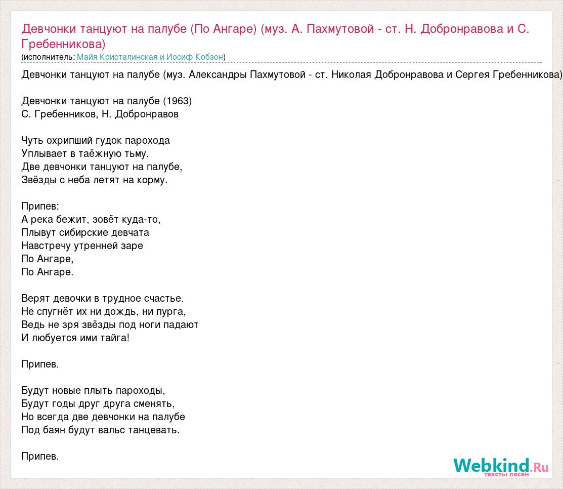 Девчонки танцуют на палубе (муз. Александры Пахмутовой - ст. Николая Добронравова и Сергея Гребенникова) Девчонки танцуют на палубе (1963) С. Гребенников, Н. Добронравов Чуть охрипший гудок парохода Уплывает в таёжную тьму. Две девчонки танцуют на палубе, Звёзды с неба летят на корму. Припев: А река бежит, зовёт куда-то, Плывут сибирские девчата Навстречу утренней заре По Ангаре, По Ангаре. Верят девочки в трудное счастье. Не спугнёт их ни дождь, ни пурга, Ведь не зря звёзды под ноги падают И любуется ими тайга! Припев. Будут новые плыть пароходы, Будут годы друг друга сменять, Но всегда две девчонки на палубе Под баян будут вальс танцевать. Припев.
