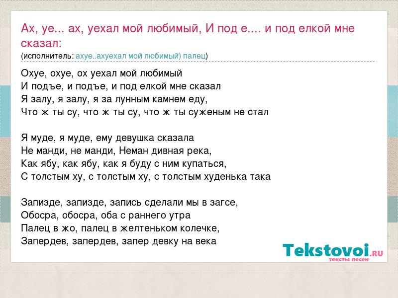 Охуе, охуе, ох уехал мой любимый И подъе, и подъе, и под елкой мне сказал Я залу, я залу, я за лунным камнем еду, Что ж ты су, что ж ты су, что ж ты суженым не стал Я муде, я муде, ему девушка сказала Hе манди, не манди, Hеман дивная река, Как ябу, как ябу, как я буду с ним купаться, С толстым ху, с толстым ху, с толстым худенька така Запизде, запизде, запись сделали мы в загсе, Обосра, обосра, оба с раннего утра Палец в жо, палец в желтеньком колечке, Запердев, запердев, запер девку на века
