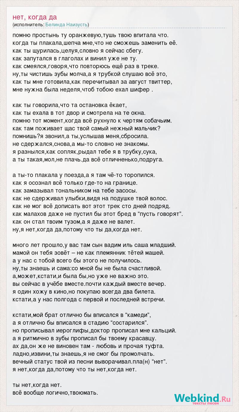 помню простынь ту оранжевую,тушь твою впитала что. когда ты плакала,шепча мне,что не сможешь заменить её. как ты щурилась,целуя,словно я сейчас сбегу. как запутался в глаголах и винил уже не ту. как смеялся,говоря,что повторюсь ещё раз в треке. ну,ты чистишь зубы молча,а я трубкой слушаю всё это, как ты мне готовила,как перечитывал за август твиттер, мне нужна была неделя,чтоб тобою ехал шифер . как ты говорила,что та остановка ёкает, как ты ехала в тот двор и смотрела на те окна. помню тот момент,когда всё рухнуло к чертям собачьим. как там поживает щас твой самый нежный мальчик? помнишь?я звонил,а ты,услышав меня,сбросила. не сдержался,снова,а мы-то словно не знакомы. я разнылся,как сопляк,рыдал тебе я в трубку,сука, а ты такая,мол,не плачь.да всё отличненько,подруга. а ты-то плакала у поезда,а я там чё-то торопился. как я осознал всё только где-то на границе. как замазывал тональником на тебе засосы. как не сдерживал улыбки,видя на подушке твой волос. как не мог всё дописать вот этот трек сто дней подряд. как малахов даже не пустил бы этот бред в “пусть говорят”. как он стал твоим тузом,а я даже не валет. ну,я нет,когда да,потому что ты да,когда нет. много лет прошло,у вас там сын вадим иль саша младший. мамой он тебя зовёт – не как племянник тётей машей. а у нас с тобой всего бы этого не получилось. ну,ты знаешь и сама:со мной бы не была счастливой. а,может,кстати,и была бы,но уже не важно это. вы сейчас в учёбе вместе.почти каждый вместе вечер. я один хожу в кино,но покупаю всегда два билета. кстати,а у нас полгода с первой и последней встречи. кстати,мой брат отлично бы вписался в “камеди”, а я отлично бы вписался в стадию “состарился”. но прописывал иероглифы,доктор прописал мне кальций. а я ритмично в зубы прописал бы твоему красавцу. ах да,он же не виновен там - любовь и прочая туфта. ладно,извини,ты знаешь,я не смог бы промолчать. вечный статус твой из песни выворачивал.пла(н) “нет”. я нет,когда да,потому что ты нет,когда нет. ты нет,когда нет. всё вообще логично,твоюмать.