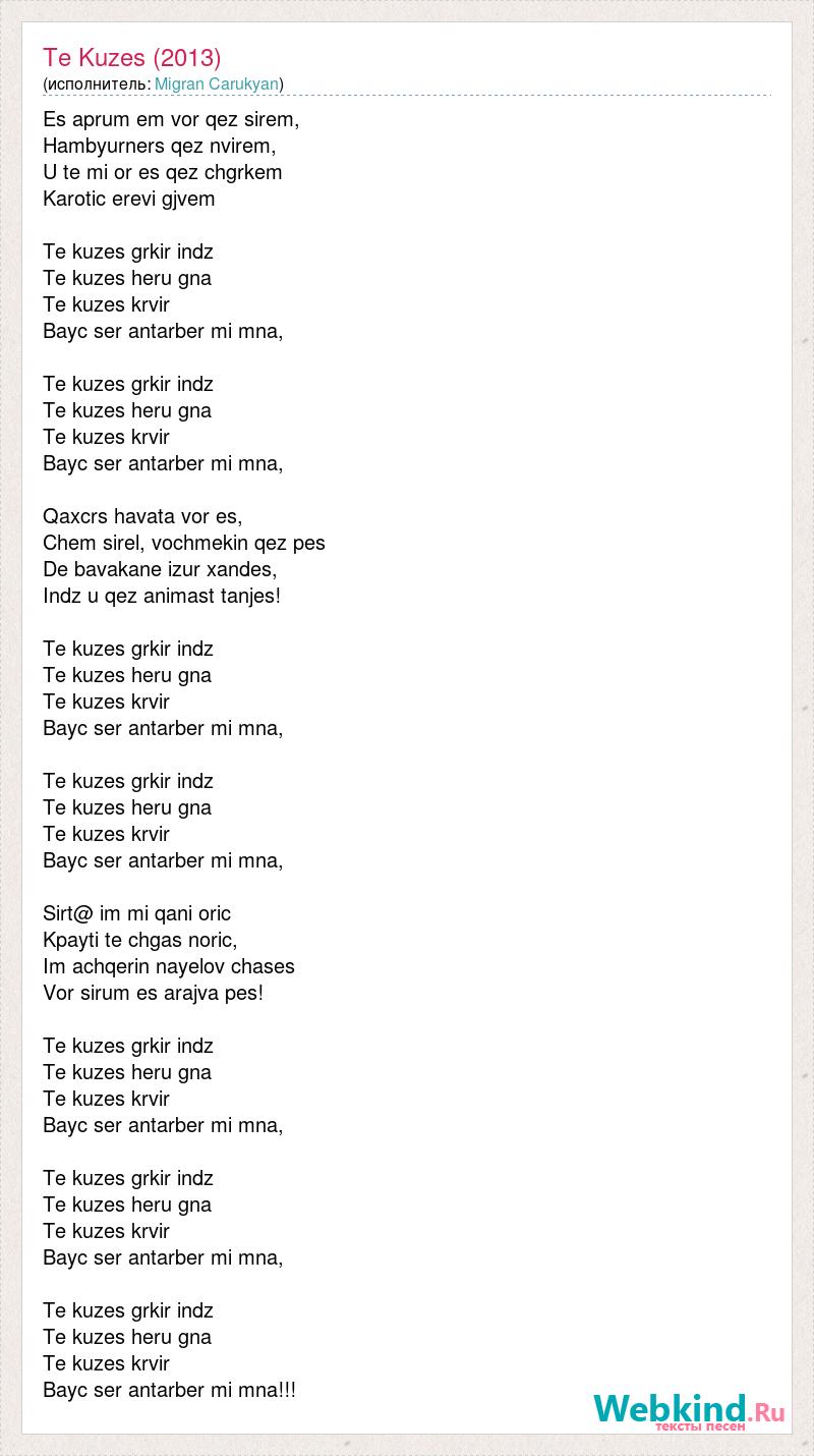 Es aprum em vor qez sirem, Hambyurners qez nvirem, U te mi or es qez chgrkem Karotic erevi gjvem Te kuzes grkir indz Te kuzes heru gna Te kuzes krvir Bayc ser antarber mi mna, Te kuzes grkir indz Te kuzes heru gna Te kuzes krvir Bayc ser antarber mi mna, Qaxcrs havata vor es, Chem sirel, vochmekin qez pes De bavakane izur xandes, Indz u qez animast tanjes! Te kuzes grkir indz Te kuzes heru gna Te kuzes krvir Bayc ser antarber mi mna, Te kuzes grkir indz Te kuzes heru gna Te kuzes krvir Bayc ser antarber mi mna, Sirt@ im mi qani oric Kpayti te chgas noric, Im achqerin nayelov chases Vor sirum es arajva pes! Te kuzes grkir indz Te kuzes heru gna Te kuzes krvir Bayc ser antarber mi mna, Te kuzes grkir indz Te kuzes heru gna Te kuzes krvir Bayc ser antarber mi mna, Te kuzes grkir indz Te kuzes heru gna Te kuzes krvir Bayc ser antarber mi mna!!!