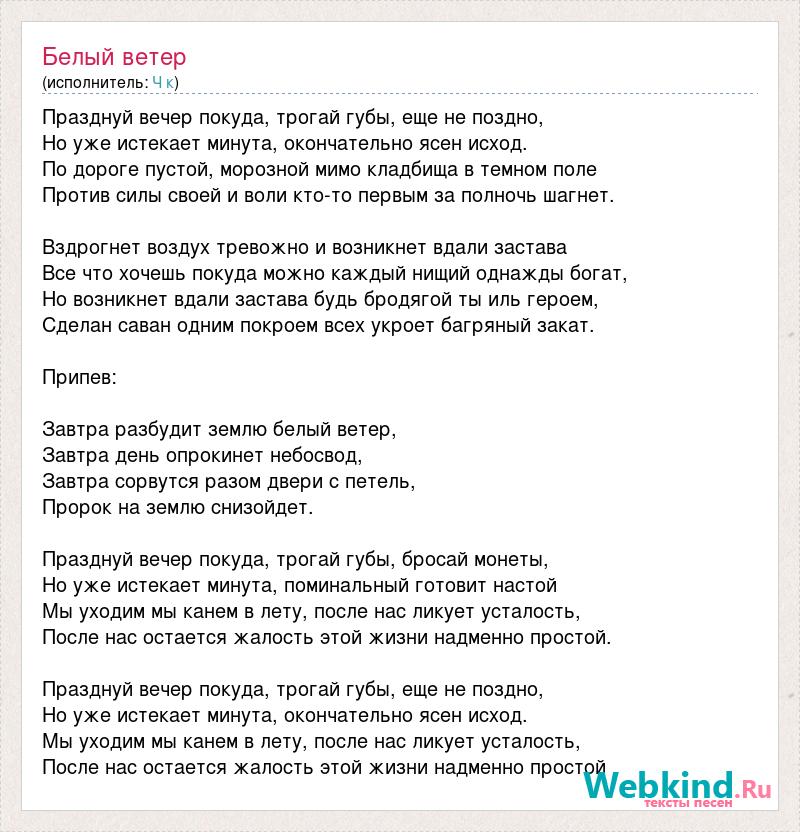 Празднуй вечер покуда, трогай губы, еще не поздно, Но уже истекает минута, окончательно ясен исход. По дороге пустой, морозной мимо кладбища в темном поле Против силы своей и воли кто-то первым за полночь шагнет. Вздрогнет воздух тревожно и возникнет вдали застава Все что хочешь покуда можно каждый нищий однажды богат, Но возникнет вдали застава будь бродягой ты иль героем, Сделан саван одним покроем всех укроет багряный закат. Припев: Завтра разбудит землю белый ветер, Завтра день опрокинет небосвод, Завтра сорвутся разом двери с петель, Пророк на землю снизойдет. Празднуй вечер покуда, трогай губы, бросай монеты, Но уже истекает минута, поминальный готовит настой Мы уходим мы канем в лету, после нас ликует усталость, После нас остается жалость этой жизни надменно простой. Празднуй вечер покуда, трогай губы, еще не поздно, Но уже истекает минута, окончательно ясен исход. Мы уходим мы канем в лету, после нас ликует усталость, После нас остается жалость этой жизни надменно простой