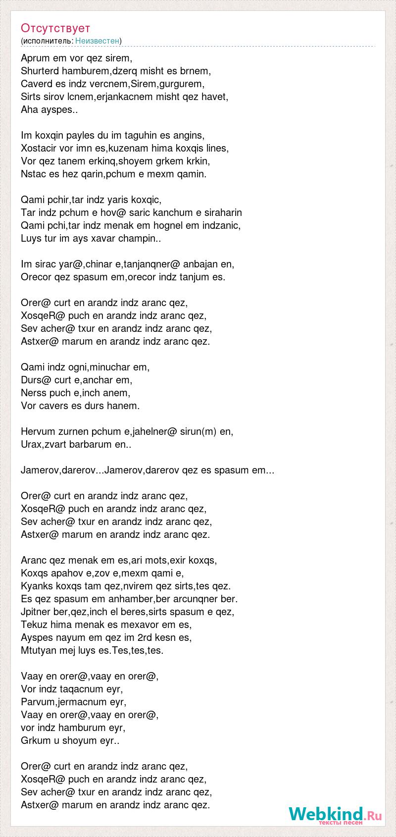 Aprum em vor qez sirem, Shurterd hamburem,dzerq misht es brnem, Caverd es indz vercnem,Sirem,gurgurem, Sirts sirov lcnem,erjankacnem misht qez havet, Aha ayspes.. Im koxqin payles du im taguhin es angins, Xostacir vor imn es,kuzenam hima koxqis lines, Vor qez tanem erkinq,shoyem grkem krkin, Nstac es hez qarin,pchum e mexm qamin. Qami pchir,tar indz yaris koxqic, Tar indz pchum e hov@ saric kanchum e siraharin Qami pchi,tar indz menak em hognel em indzanic, Luys tur im ays xavar champin.. Im sirac yar@,chinar e,tanjanqner@ anbajan en, Orecor qez spasum em,orecor indz tanjum es. Orer@ curt en arandz indz aranc qez, XosqeR@ puch en arandz indz aranc qez, Sev acher@ txur en arandz indz aranc qez, Astxer@ marum en arandz indz aranc qez. Qami indz ogni,minuchar em, Durs@ curt e,anchar em, Nerss puch e,inch anem, Vor cavers es durs hanem. Hervum zurnen pchum e,jahelner@ sirun(m) en, Urax,zvart barbarum en.. Jamerov,darerov...Jamerov,darerov qez es spasum em... Orer@ curt en arandz indz aranc qez, XosqeR@ puch en arandz indz aranc qez, Sev acher@ txur en arandz indz aranc qez, Astxer@ marum en arandz indz aranc qez. Aranc qez menak em es,ari mots,exir koxqs, Koxqs apahov e,zov e,mexm qami e, Kyanks koxqs tam qez,nvirem qez sirts,tes qez. Es qez spasum em anhamber,ber arcunqner ber. Jpitner ber,qez,inch el beres,sirts spasum e qez, Tekuz hima menak es mexavor em es, Ayspes nayum em qez im 2rd kesn es, Mtutyan mej luys es.Tes,tes,tes. Vaay en orer@,vaay en orer@, Vor indz taqacnum eyr, Parvum,jermacnum eyr, Vaay en orer@,vaay en orer@, vor indz hamburum eyr, Grkum u shoyum eyr.. Orer@ curt en arandz indz aranc qez, XosqeR@ puch en arandz indz aranc qez, Sev acher@ txur en arandz indz aranc qez, Astxer@ marum en arandz indz aranc qez.