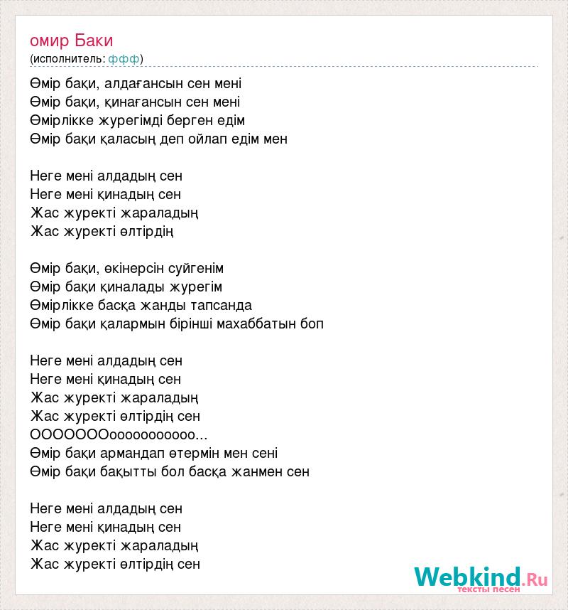 Өмір бақи, алдағансын сен мені Өмір бақи, қинағансын сен мені Өмірлікке журегімді берген едім Өмір бақи қаласың деп ойлап едім мен Неге мені алдадың сен Неге мені қинадың сен Жас журекті жараладың Жас журекті өлтірдің Өмір бақи, өкінерсін суйгенім Өмір бақи қиналады журегім Өмірлікке басқа жанды тапсанда Өмір бақи қалармын бірінші махаббатын боп Неге мені алдадың сен Неге мені қинадың сен Жас журекті жараладың Жас журекті өлтірдің сен ОООООООооооооооооо... Өмір бақи армандап өтермін мен сені Өмір бақи бақытты бол басқа жанмен сен Неге мені алдадың сен Неге мені қинадың сен Жас журекті жараладың Жас журекті өлтірдің сен