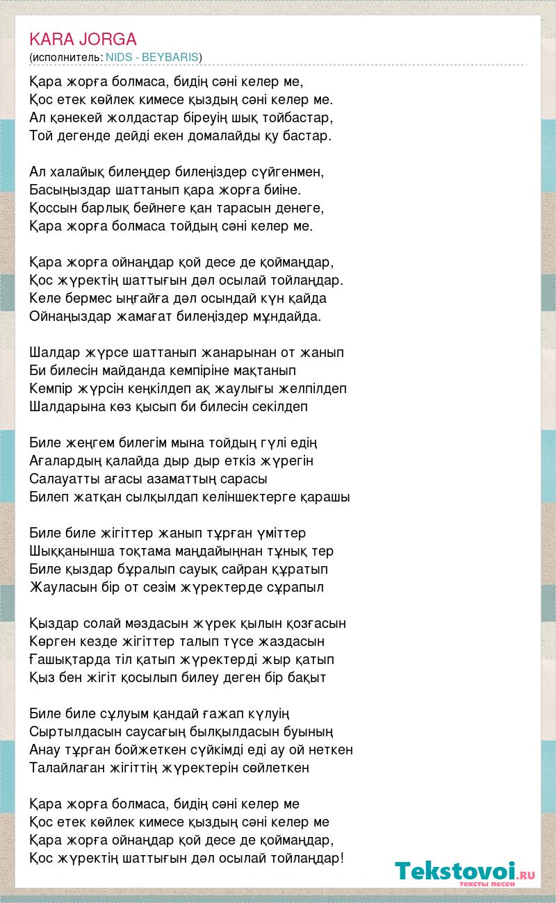 Қара жорға болмаса, бидің сәні келер ме, Қос етек көйлек кимесе қыздың сәні келер ме. Ал қәнекей жолдастар біреуің шық тойбастар, Той дегенде дейді екен домалайды қу бастар. Ал халайық билеңдер билеңіздер сүйгенмен, Басыңыздар шаттанып қара жорға биіне. Қоссын барлық бейнеге қан тарасын денеге, Қара жорға болмаса тойдың сәні келер ме. Қара жорға ойнаңдар қой десе де қоймаңдар, Қос жүректің шаттығын дәл осылай тойлаңдар. Келе бермес ыңғайға дәл осындай күн қайда Ойнаңыздар жамағат билеңіздер мұндайда. Шалдар жүрсе шаттанып жанарынан от жанып Би билесін майданда кемпіріне мақтанып Кемпір жүрсін кеңкілдеп ақ жаулығы желпілдеп Шалдарына көз қысып би билесін секілдеп Биле жеңгем билегім мына тойдың гүлі едің Ағалардың қалайда дыр дыр еткіз жүрегін Салауатты ағасы азаматтың сарасы Билеп жатқан сылқылдап келіншектерге қарашы Биле биле жігіттер жанып тұрған үміттер Шыққанынша тоқтама маңдайыңнан тұнық тер Биле қыздар бұралып сауық сайран құратып Жауласын бір от сезім жүректерде сұрапыл Қыздар солай мәздасын жүрек қылын қозғасын Көрген кезде жігіттер талып түсе жаздасын Ғашықтарда тіл қатып жүректерді жыр қатып Қыз бен жігіт қосылып билеу деген бір бақыт Биле биле сұлуым қандай ғажап күлуің Сыртылдасын саусағың былқылдасын буының Анау тұрған бойжеткен сүйкімді еді ау ой неткен Талайлаған жігіттің жүректерін сөйлеткен Қара жорға болмаса, бидің сәні келер ме Қос етек көйлек кимесе қыздың сәні келер ме Қара жорға ойнаңдар қой десе де қоймаңдар, Қос жүректің шаттығын дәл осылай тойлаңдар!