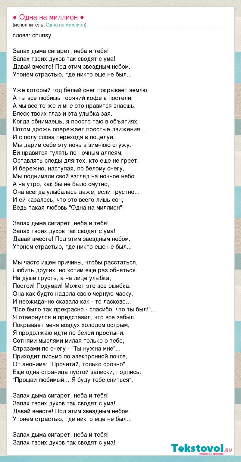 слова: chunsy Запах дыма сигарет, неба и тебя! Запах твоих духов так сводят с ума! Давай вместе! Под этим звездным небом. Утонем страстью, где никто еще не был... Уже который год белый снег покрывает землю, А ты все любишь горячий кофе в постели. А мы все те же и мне это нравится знаешь, Блеск твоих глаз и эта улыбка зая. Когда обнимаешь, я просто таю в объятиях, Потом дрожь опережает простые движения... И с полу слова переходя в поцелуи, Мы дарим себе эту ночь в зимнюю стужу. Ей нравится гулять по ночным аллеям, Оставлять следы для тех, кто еще не греет. И бережно, наступая, по белому снегу, Мы поднимали свой взгляд на ночное небо. А на утро, как бы не было смутно, Она всегда улыбалась даже, если грустно... И ей казалось, что это всего лишь сон, Ведь такая любовь "Одна на миллион"! Запах дыма сигарет, неба и тебя! Запах твоих духов так сводят с ума! Давай вместе! Под этим звездным небом. Утонем страстью, где никто еще не был... Мы часто ищем причины, чтобы расстаться, Любить других, но хотим еще раз обняться. На душе грусть, а на лице улыбка, Постой! Подумай! Может это все ошибка. Она как будто надела свою черную маску, И неожиданно сказала как - то ласково... "Все было так прекрасно - спасибо, что ты был!"... Я отвернулся и представил, что все забыл. Покрывает меня воздух холодом острым, Я продолжаю идти по белой простыни. Сотнями мыслями милая только о тебе, Стразами по снегу - "Ты нужна мне"... Приходит письмо по электронной почте, От анонима: "Прочитай, только срочно". Еще одна страница пустой записки, подпись: "Прощай любимый... Я буду тебе сниться". Запах дыма сигарет, неба и тебя! Запах твоих духов так сводят с ума! Давай вместе! Под этим звездным небом. Утонем страстью, где никто еще не был... Запах дыма сигарет, неба и тебя! Запах твоих духов так сводят с ума!