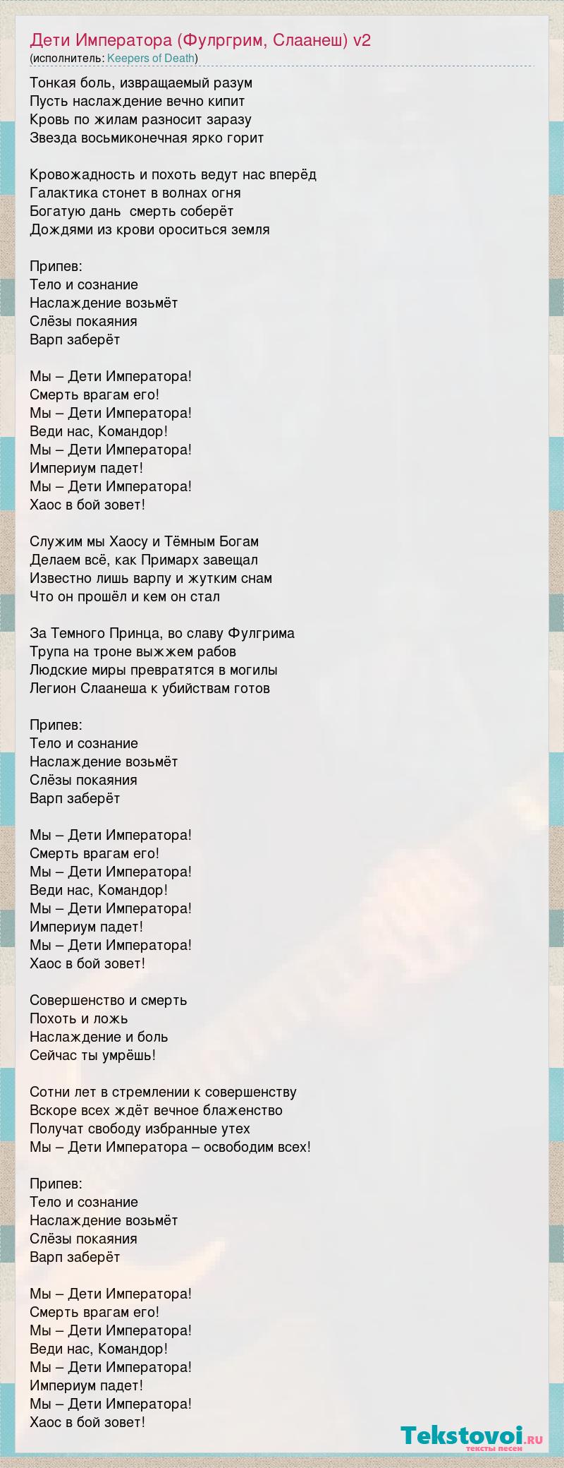 Тонкая боль, извращаемый разум Пусть наслаждение вечно кипит Кровь по жилам разносит заразу Звезда восьмиконечная ярко горит Кровожадность и похоть ведут нас вперёд Галактика стонет в волнах огня Богатую дань смерть соберёт Дождями из крови ороситься земля Припев: Тело и сознание Наслаждение возьмёт Слёзы покаяния Варп заберёт Мы – Дети Императора! Смерть врагам его! Мы – Дети Императора! Веди нас, Командор! Мы – Дети Императора! Империум падет! Мы – Дети Императора! Хаос в бой зовет! Служим мы Хаосу и Тёмным Богам Делаем всё, как Примарх завещал Известно лишь варпу и жутким снам Что он прошёл и кем он стал За Темного Принца, во славу Фулгрима Трупа на троне выжжем рабов Людские миры превратятся в могилы Легион Слаанеша к убийствам готов Припев: Тело и сознание Наслаждение возьмёт Слёзы покаяния Варп заберёт Мы – Дети Императора! Смерть врагам его! Мы – Дети Императора! Веди нас, Командор! Мы – Дети Императора! Империум падет! Мы – Дети Императора! Хаос в бой зовет! Совершенство и смерть Похоть и ложь Наслаждение и боль Сейчас ты умрёшь! Сотни лет в стремлении к совершенству Вскоре всех ждёт вечное блаженство Получат свободу избранные утех Мы – Дети Императора – освободим всех! Припев: Тело и сознание Наслаждение возьмёт Слёзы покаяния Варп заберёт Мы – Дети Императора! Смерть врагам его! Мы – Дети Императора! Веди нас, Командор! Мы – Дети Императора! Империум падет! Мы – Дети Императора! Хаос в бой зовет!