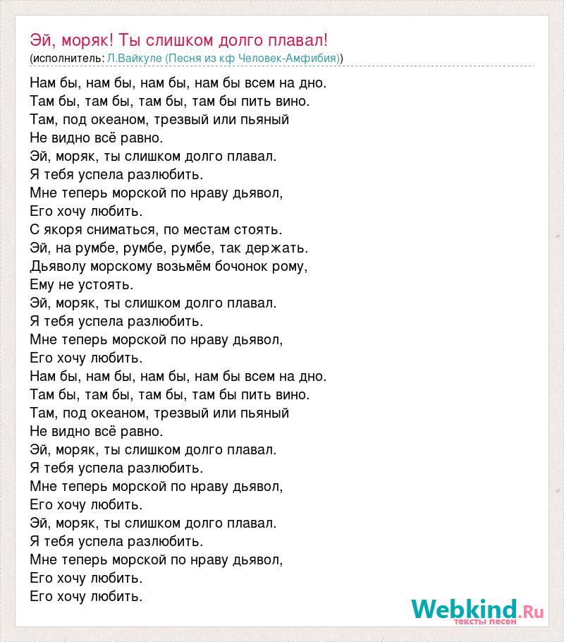Нам бы, нам бы, нам бы, нам бы всем на дно. Там бы, там бы, там бы, там бы пить вино. Там, под океаном, трезвый или пьяный Не видно всё равно. Эй, моряк, ты слишком долго плавал. Я тебя успела разлюбить. Мне теперь морской по нраву дьявол, Его хочу любить. С якоря сниматься, по местам стоять. Эй, на румбе, румбе, румбе, так держать. Дьяволу морскому возьмём бочонок рому, Ему не устоять. Эй, моряк, ты слишком долго плавал. Я тебя успела разлюбить. Мне теперь морской по нраву дьявол, Его хочу любить. Нам бы, нам бы, нам бы, нам бы всем на дно. Там бы, там бы, там бы, там бы пить вино. Там, под океаном, трезвый или пьяный Не видно всё равно. Эй, моряк, ты слишком долго плавал. Я тебя успела разлюбить. Мне теперь морской по нраву дьявол, Его хочу любить. Эй, моряк, ты слишком долго плавал. Я тебя успела разлюбить. Мне теперь морской по нраву дьявол, Его хочу любить. Его хочу любить.