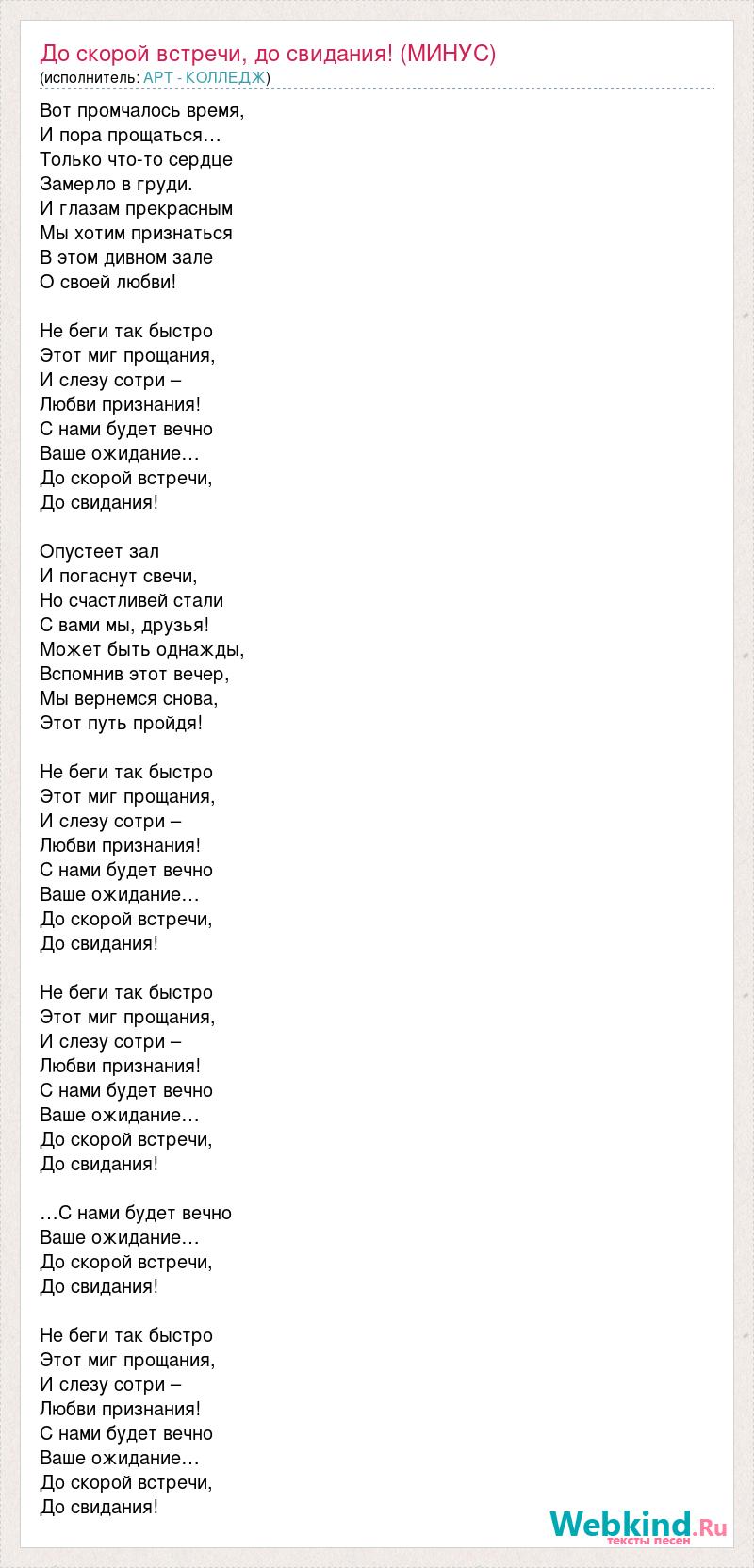 Вот промчалось время, И пора прощаться… Только что-то сердце Замерло в груди. И глазам прекрасным Мы хотим признаться В этом дивном зале О своей любви! Не беги так быстро Этот миг прощания, И слезу сотри – Любви признания! С нами будет вечно Ваше ожидание… До скорой встречи, До свидания! Опустеет зал И погаснут свечи, Но счастливей стали С вами мы, друзья! Может быть однажды, Вспомнив этот вечер, Мы вернемся снова, Этот путь пройдя! Не беги так быстро Этот миг прощания, И слезу сотри – Любви признания! С нами будет вечно Ваше ожидание… До скорой встречи, До свидания! Не беги так быстро Этот миг прощания, И слезу сотри – Любви признания! С нами будет вечно Ваше ожидание… До скорой встречи, До свидания! …С нами будет вечно Ваше ожидание… До скорой встречи, До свидания! Не беги так быстро Этот миг прощания, И слезу сотри – Любви признания! С нами будет вечно Ваше ожидание… До скорой встречи, До свидания!