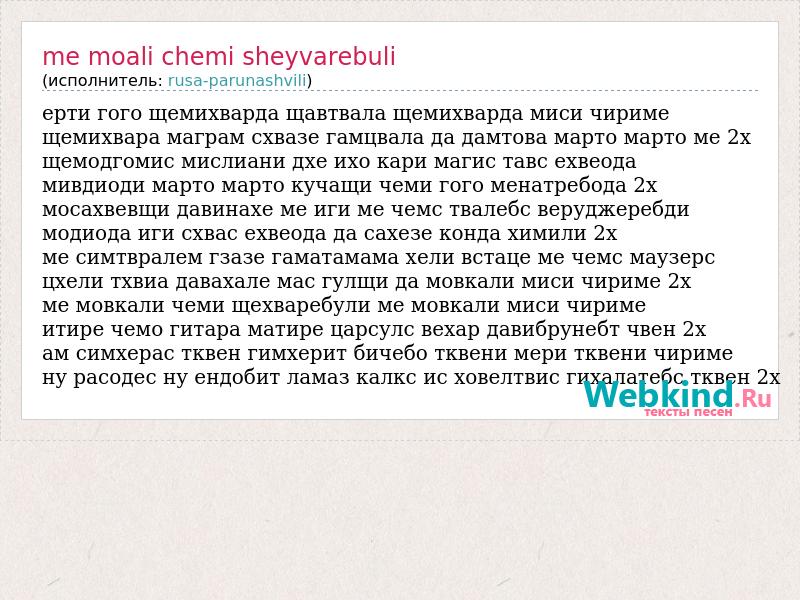 ерти гого щемихварда щавтвала щемихварда миси чириме щемихвара маграм схвазе гамцвала да дамтова марто марто ме 2х щемодгомис мислиани дхе ихо кари магис тавс ехвеода мивдиоди марто марто кучащи чеми гого менатребода 2х мосахвевщи давинахе ме иги ме чемс твалебс веруджеребди модиода иги схвас ехвеода да сахезе конда химили 2х ме симтвралем гзазе гаматамама хели встаце ме чемс маузерс цхели тхвиа давахале мас гулщи да мовкали миси чириме 2х ме мовкали чеми щехваребули ме мовкали миси чириме итире чемо гитара матире царсулс вехар давибрунебт чвен 2х ам симхерас тквен гимхерит бичебо тквени мери тквени чириме ну расодес ну ендобит ламаз калкс ис ховелтвис гихалатебс тквен 2х