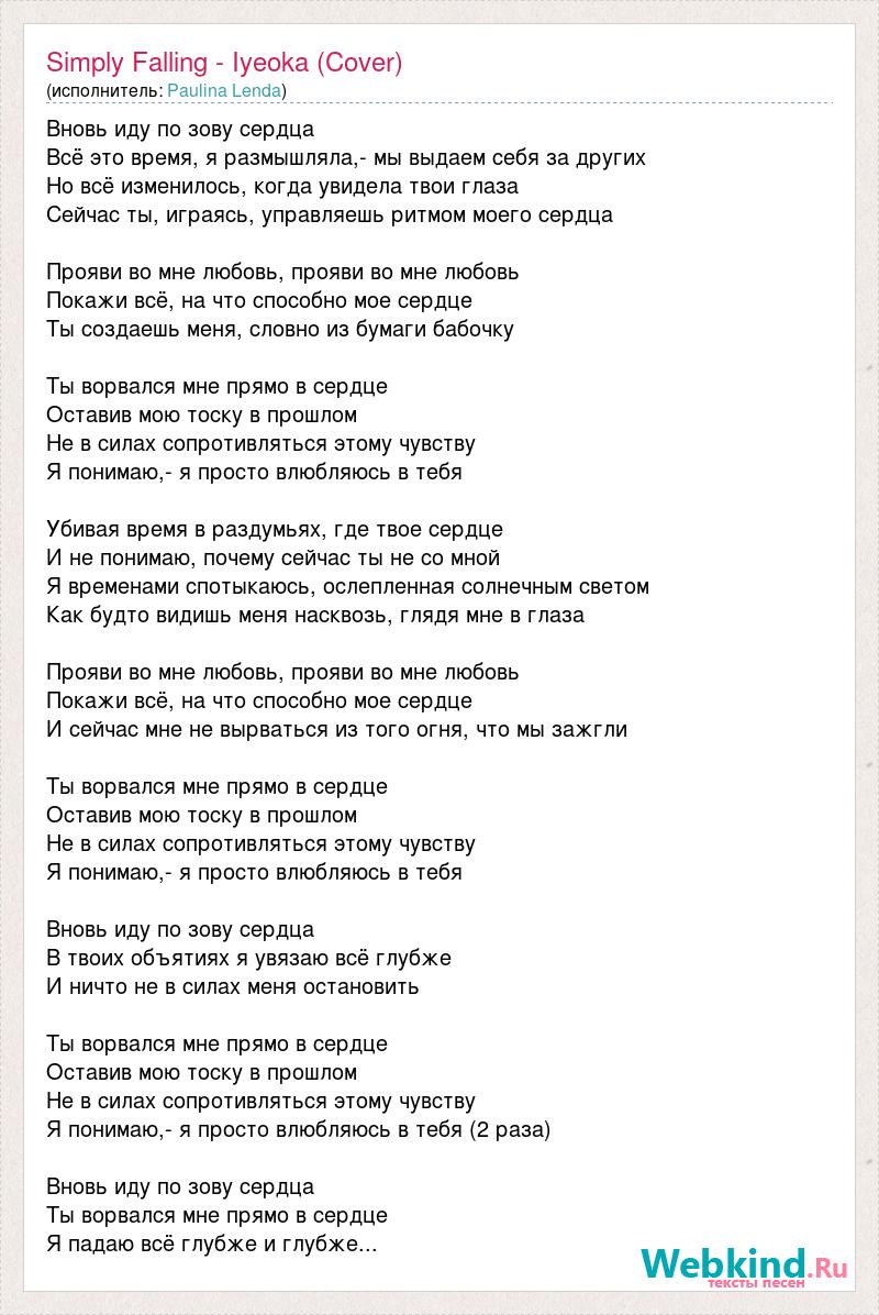 Вновь иду по зову сердца Всё это время, я размышляла,- мы выдаем себя за других Но всё изменилось, когда увидела твои глаза Сейчас ты, играясь, управляешь ритмом моего сердца Прояви во мне любовь, прояви во мне любовь Покажи всё, на что способно мое сердце Ты создаешь меня, словно из бумаги бабочку Ты ворвался мне прямо в сердце Оставив мою тоску в прошлом Не в силах сопротивляться этому чувству Я понимаю,- я просто влюбляюсь в тебя Убивая время в раздумьях, где твое сердце И не понимаю, почему сейчас ты не со мной Я временами спотыкаюсь, ослепленная солнечным светом Как будто видишь меня насквозь, глядя мне в глаза Прояви во мне любовь, прояви во мне любовь Покажи всё, на что способно мое сердце И сейчас мне не вырваться из того огня, что мы зажгли Ты ворвался мне прямо в сердце Оставив мою тоску в прошлом Не в силах сопротивляться этому чувству Я понимаю,- я просто влюбляюсь в тебя Вновь иду по зову сердца В твоих объятиях я увязаю всё глубже И ничто не в силах меня остановить Ты ворвался мне прямо в сердце Оставив мою тоску в прошлом Не в силах сопротивляться этому чувству Я понимаю,- я просто влюбляюсь в тебя (2 раза) Вновь иду по зову сердца Ты ворвался мне прямо в сердце Я падаю всё глубже и глубже...