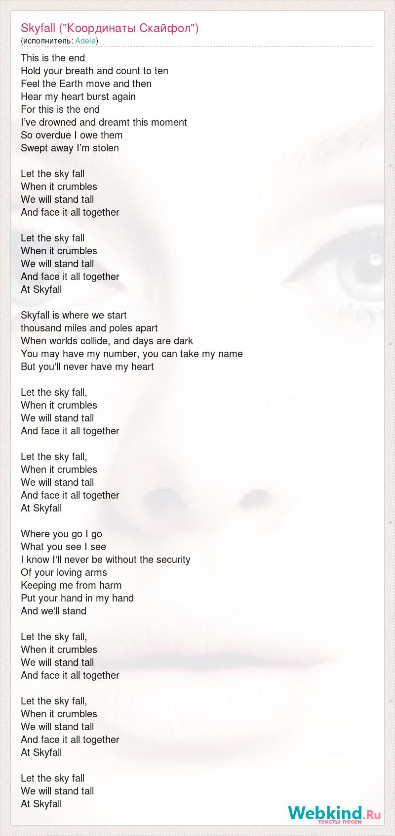 This is the end Hold your breath and count to ten Feel the Earth move and then Hear my heart burst again For this is the end I’ve drowned and dreamt this moment So overdue I owe them Swept away I’m stolen Let the sky fall When it crumbles We will stand tall And face it all together Let the sky fall When it crumbles We will stand tall And face it all together At Skyfall Skyfall is where we start thousand miles and poles apart When worlds collide, and days are dark You may have my number, you can take my name But you'll never have my heart Let the sky fall, When it crumbles We will stand tall And face it all together Let the sky fall, When it crumbles We will stand tall And face it all together At Skyfall Where you go I go What you see I see I know I'll never be without the security Of your loving arms Keeping me from harm Put your hand in my hand And we'll stand Let the sky fall, When it crumbles We will stand tall And face it all together Let the sky fall, When it crumbles We will stand tall And face it all together At Skyfall Let the sky fall We will stand tall At Skyfall
