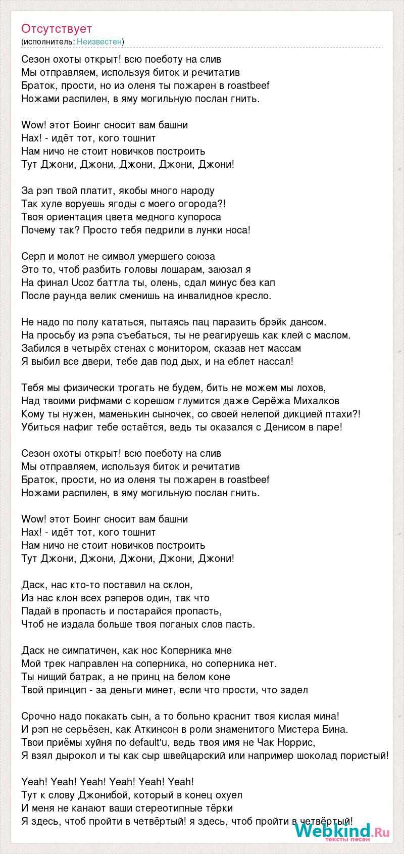 Сезон охоты открыт! всю поеботу на слив Мы отправляем, используя биток и речитатив Браток, прости, но из оленя ты пожарен в roastbeef Ножами распилен, в яму могильную послан гнить. Wow! этот Боинг сносит вам башни Нах! - идёт тот, кого тошнит Нам ничо не стоит новичков построить Тут Джони, Джони, Джони, Джони, Джони! За рэп твой платит, якобы много народу Так хуле воруешь ягоды с моего огорода?! Твоя ориентация цвета медного купороса Почему так? Просто тебя педрили в лунки носа! Серп и молот не символ умершего союза Это то, чтоб разбить головы лошарам, заюзал я На финал Ucoz баттла ты, олень, сдал минус без кап После раунда велик сменишь на инвалидное кресло. Не надо по полу кататься, пытаясь пац паразить брэйк дансом. На просьбу из рэпа съебаться, ты не реагируешь как клей с маслом. Забился в четырёх стенах с монитором, сказав нет массам Я выбил все двери, тебе дав под дых, и на еблет нассал! Тебя мы физически трогать не будем, бить не можем мы лохов, Над твоими рифмами с корешом глумится даже Серёжа Михалков Кому ты нужен, маменькин сыночек, со своей нелепой дикцией птахи?! Убиться нафиг тебе остаётся, ведь ты оказался с Денисом в паре! Сезон охоты открыт! всю поеботу на слив Мы отправляем, используя биток и речитатив Браток, прости, но из оленя ты пожарен в roastbeef Ножами распилен, в яму могильную послан гнить. Wow! этот Боинг сносит вам башни Нах! - идёт тот, кого тошнит Нам ничо не стоит новичков построить Тут Джони, Джони, Джони, Джони, Джони! Даск, нас кто-то поставил на склон, Из нас клон всех рэперов один, так что Падай в пропасть и постарайся пропасть, Чтоб не издала больше твоя поганых слов пасть. Даск не симпатичен, как нос Коперника мне Мой трек направлен на соперника, но соперника нет. Ты нищий батрак, а не принц на белом коне Твой принцип - за деньги минет, если что прости, что задел Срочно надо покакать сын, а то больно краснит твоя кислая мина! И рэп не серьёзен, как Аткинсон в роли знаменитого Мистера Бина. Твои приёмы хуйня по default'u, ведь твоя имя не Чак Норрис, Я взял дырокол и ты как сыр швейцарский или например шоколад пористый! Yeah! Yeah! Yeah! Yeah! Yeah! Yeah! Тут к слову Джонибой, который в конец охуел И меня не канают ваши стереотипные тёрки Я здесь, чтоб пройти в четвёртый! я здесь, чтоб пройти в четвёртый!
