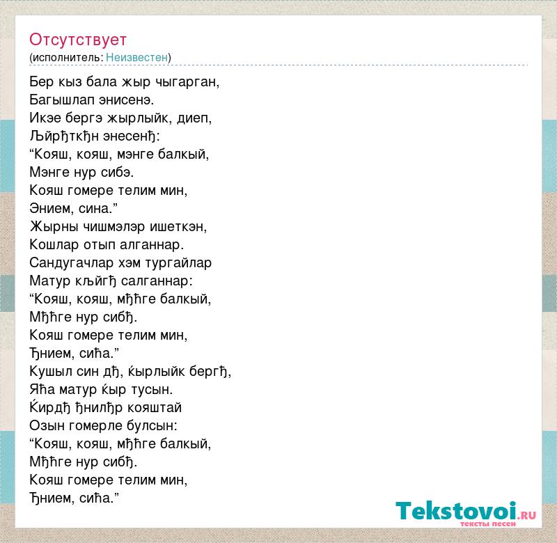 Бер кыз бала жыр чыгарган, Багышлап энисенэ. Икэe бергэ жырлыйк, диеп, Љйрђткђн энесенђ: “Кояш, кояш, мэнге балкый, Мэнге нур сибэ. Кояш гомере телим мин, Энием, сина.” Жырны чишмэлэр ишеткэн, Кошлар отып алганнар. Сандугачлар хэм тургайлар Матур кљйгђ салганнар: “Кояш, кояш, мђћге балкый, Мђћге нур сибђ. Кояш гомере телим мин, Ђнием, сића.” Кушыл син дђ, ќырлыйк бергђ, Яћа матур ќыр тусын. Ќирдђ ђнилђр кояштай Озын гомерле булсын: “Кояш, кояш, мђћге балкый, Мђћге нур сибђ. Кояш гомере телим мин, Ђнием, сића.”