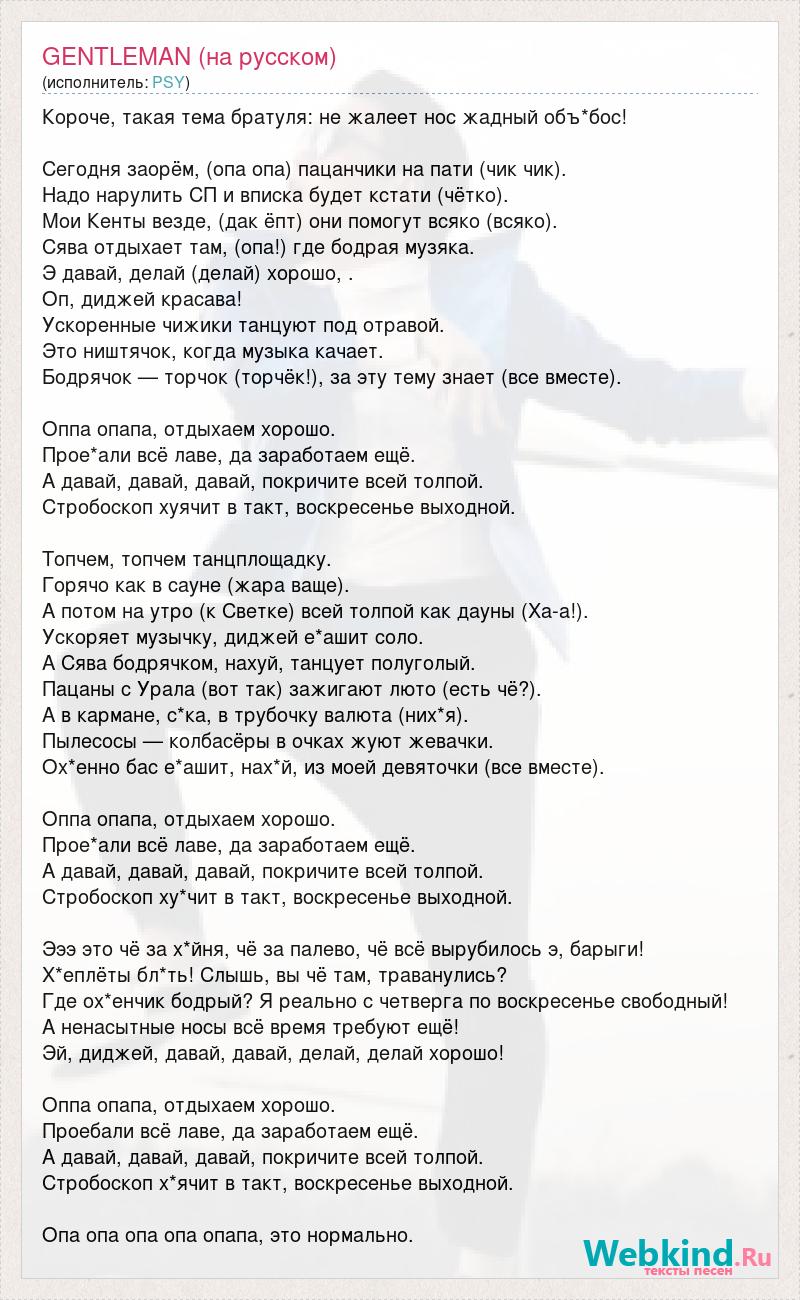 Короче, такая тема братуля: не жалеет нос жадный объ*бос! Сегодня заорём, (опа опа) пацанчики на пати (чик чик). Надо нарулить СП и вписка будет кстати (чётко). Мои Кенты везде, (дак ёпт) они помогут всяко (всяко). Сява отдыхает там, (опа!) где бодрая музяка. Э давай, делай (делай) хорошо, . Оп, диджей красава! Ускоренные чижики танцуют под отравой. Это ништячок, когда музыка качает. Бодрячок — торчок (торчёк!), за эту тему знает (все вместе). Оппа опапа, отдыхаем хорошо. Прое*али всё лаве, да заработаем ещё. А давай, давай, давай, покричите всей толпой. Стробоскоп хуячит в такт, воскресенье выходной. Топчем, топчем танцплощадку. Горячо как в сауне (жара ваще). А потом на утро (к Светке) всей толпой как дауны (Ха-а!). Ускоряет музычку, диджей е*ашит соло. А Сява бодрячком, нахуй, танцует полуголый. Пацаны с Урала (вот так) зажигают люто (есть чё?). А в кармане, с*ка, в трубочку валюта (них*я). Пылесосы — колбасёры в очках жуют жевачки. Ох*енно бас е*ашит, нах*й, из моей девяточки (все вместе). Оппа опапа, отдыхаем хорошо. Прое*али всё лаве, да заработаем ещё. А давай, давай, давай, покричите всей толпой. Стробоскоп ху*чит в такт, воскресенье выходной. Эээ это чё за х*йня, чё за палево, чё всё вырубилось э, барыги! Х*еплёты бл*ть! Слышь, вы чё там, траванулись? Где ох*енчик бодрый? Я реально с четверга по воскресенье свободный! А ненасытные носы всё время требуют ещё! Эй, диджей, давай, давай, делай, делай хорошо! Оппа опапа, отдыхаем хорошо. Проебали всё лаве, да заработаем ещё. А давай, давай, давай, покричите всей толпой. Стробоскоп х*ячит в такт, воскресенье выходной. Опа опа опа опа опапа, это нормально.