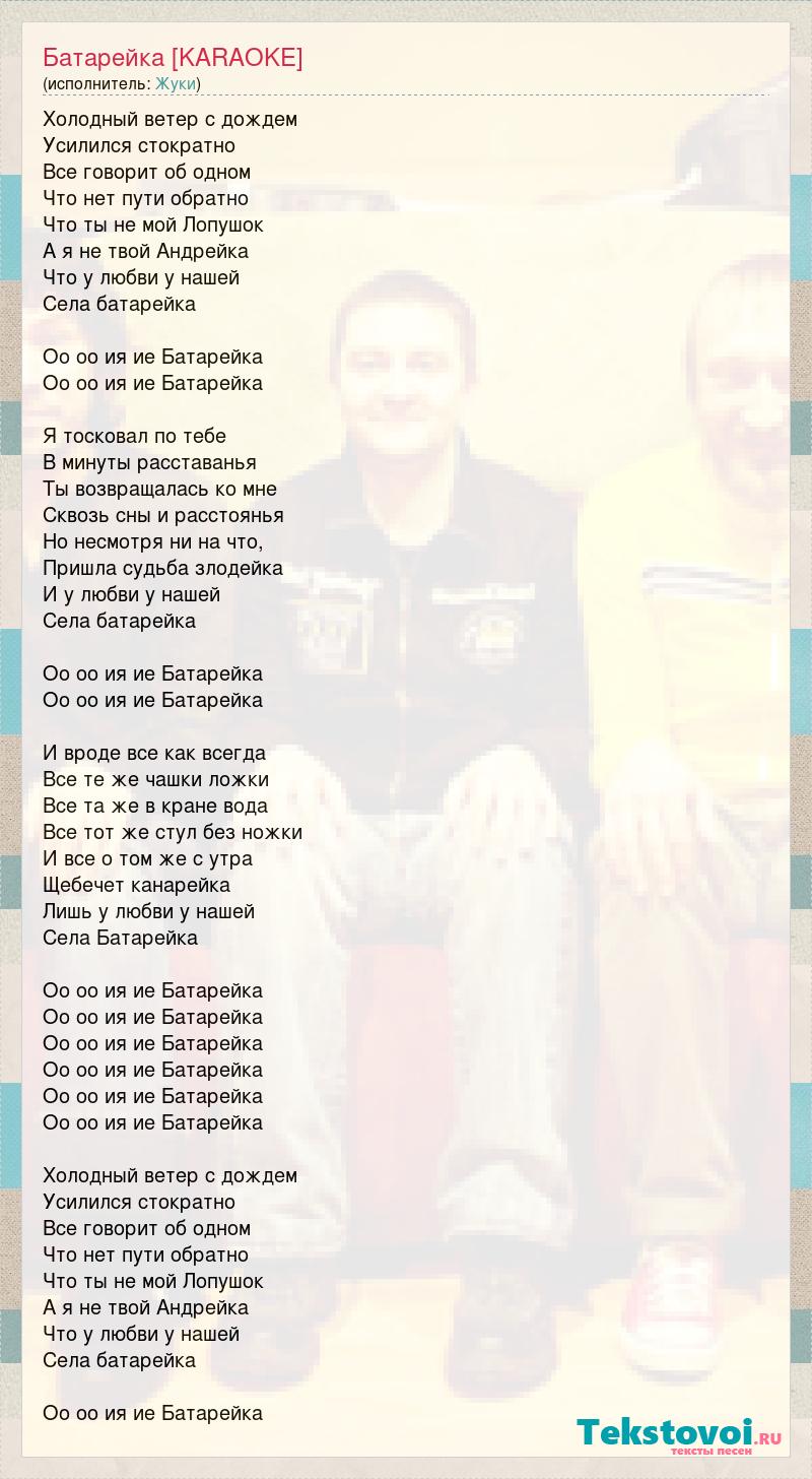 Холодный ветер с дождем Усилился стократно Все говорит об одном Что нет пути обратно Что ты не мой Лопушок А я не твой Андрейка Что у любви у нашей Села батарейка Оо оо ия ие Батарейка Оо оо ия ие Батарейка Я тосковал по тебе В минуты расставанья Ты возвращалась ко мне Сквозь сны и расстоянья Но несмотря ни на что, Пришла судьба злодейка И у любви у нашей Села батарейка Оо оо ия ие Батарейка Оо оо ия ие Батарейка И вроде все как всегда Все те же чашки ложки Все та же в кране вода Все тот же стул без ножки И все о том же с утра Щебечет канарейка Лишь у любви у нашей Села Батарейка Оо оо ия ие Батарейка Оо оо ия ие Батарейка Оо оо ия ие Батарейка Оо оо ия ие Батарейка Оо оо ия ие Батарейка Оо оо ия ие Батарейка Холодный ветер с дождем Усилился стократно Все говорит об одном Что нет пути обратно Что ты не мой Лопушок А я не твой Андрейка Что у любви у нашей Села батарейка Оо оо ия ие Батарейка