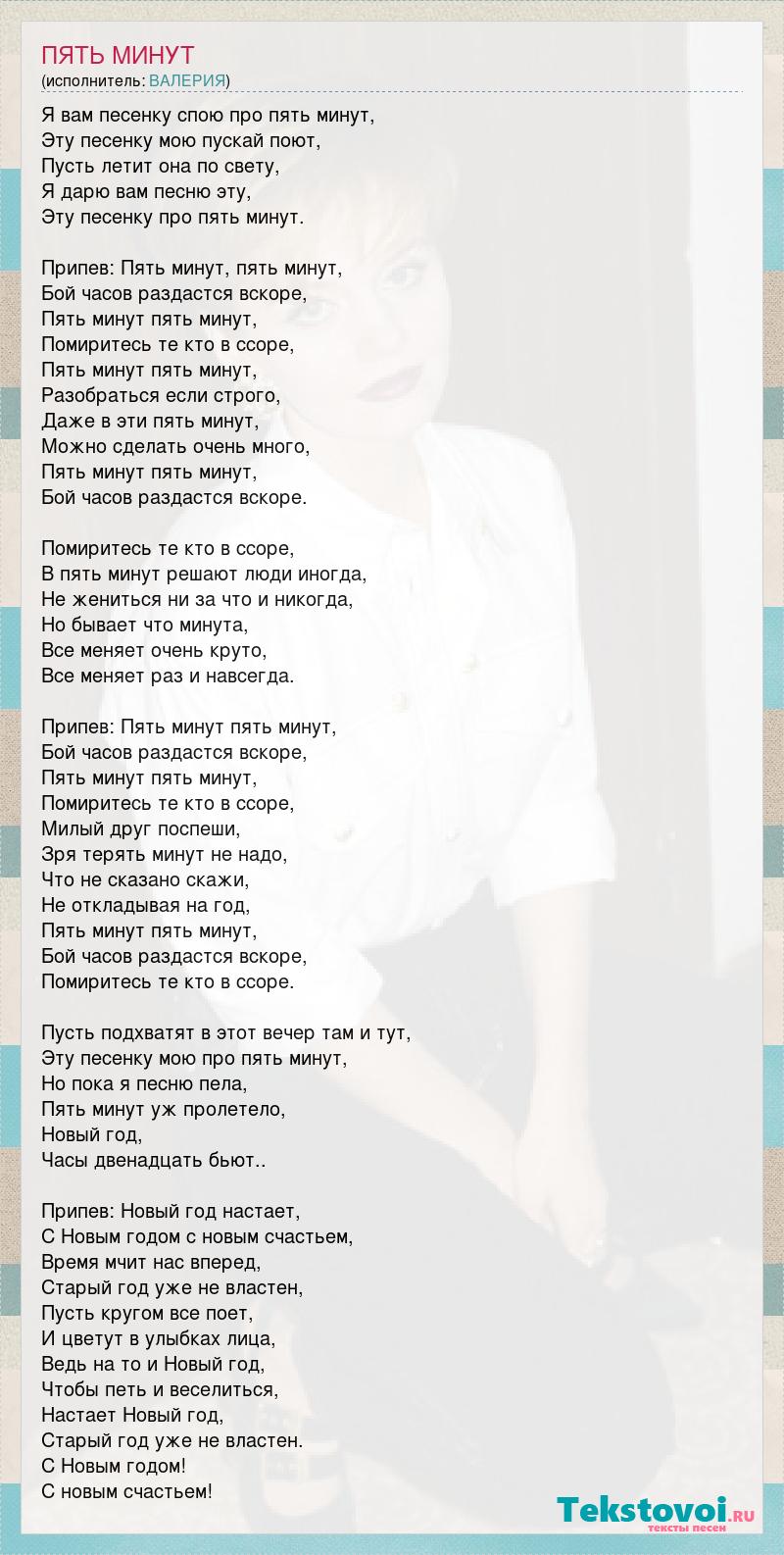 Я вам песенку спою про пять минут, Эту песенку мою пускай поют, Пусть летит она по свету, Я дарю вам песню эту, Эту песенку про пять минут. Припев: Пять минут, пять минут, Бой часов раздастся вскоре, Пять минут пять минут, Помиритесь те кто в ссоре, Пять минут пять минут, Разобраться если строго, Даже в эти пять минут, Можно сделать очень много, Пять минут пять минут, Бой часов раздастся вскоре. Помиритесь те кто в ссоре, В пять минут решают люди иногда, Не жениться ни за что и никогда, Но бывает что минута, Все меняет очень круто, Все меняет раз и навсегда. Припев: Пять минут пять минут, Бой часов раздастся вскоре, Пять минут пять минут, Помиритесь те кто в ссоре, Милый друг поспеши, Зря терять минут не надо, Что не сказано скажи, Не откладывая на год, Пять минут пять минут, Бой часов раздастся вскоре, Помиритесь те кто в ссоре. Пусть подхватят в этот вечер там и тут, Эту песенку мою про пять минут, Но пока я песню пела, Пять минут уж пролетело, Новый год, Часы двенадцать бьют.. Припев: Новый год настает, С Новым годом с новым счастьем, Время мчит нас вперед, Старый год уже не властен, Пусть кругом все поет, И цветут в улыбках лица, Ведь на то и Новый год, Чтобы петь и веселиться, Настает Новый год, Старый год уже не властен. С Новым годом! С новым счастьем!