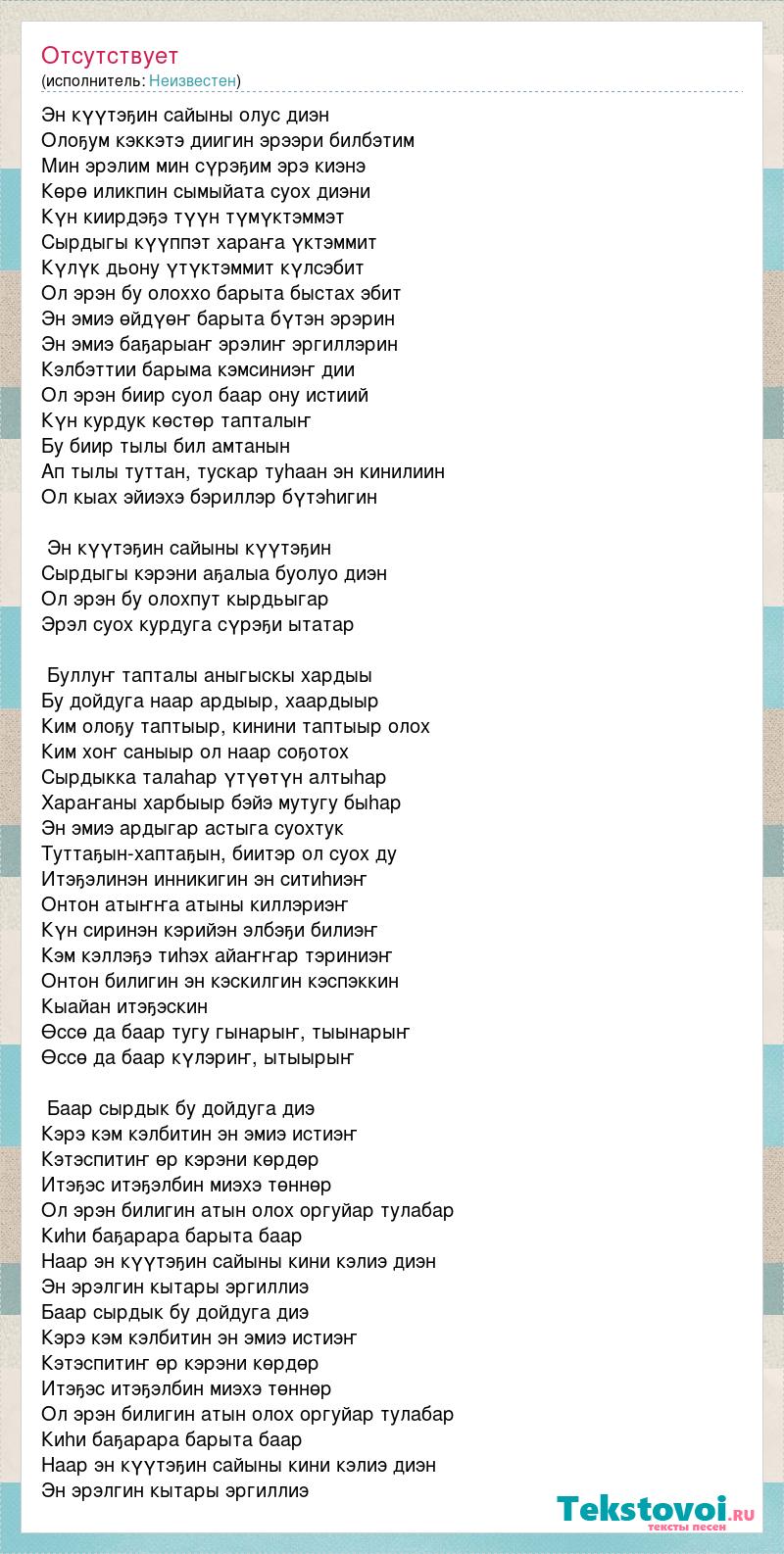 Эн күүтэҕин сайыны олус диэн Олоҕум кэккэтэ диигин эрээри билбэтим Мин эрэлим мин сүрэҕим эрэ киэнэ Көрө иликпин сымыйата суох диэни Күн киирдэҕэ түүн түмүктэммэт Сырдыгы күүппэт хараҥа үктэммит Күлүк дьону үтүктэммит күлсэбит Ол эрэн бу олоххо барыта быстах эбит Эн эмиэ өйдүөҥ барыта бүтэн эрэрин Эн эмиэ баҕарыаҥ эрэлиҥ эргиллэрин Кэлбэттии барыма кэмсиниэҥ дии Ол эрэн биир суол баар ону истиий Күн курдук көстөр тапталыҥ Бу биир тылы бил амтанын Ап тылы туттан, тускар туhаан эн кинилиин Ол кыах эйиэхэ бэриллэр бүтэhигин Эн күүтэҕин сайыны күүтэҕин Сырдыгы кэрэни аҕалыа буолуо диэн Ол эрэн бу олохпут кырдьыгар Эрэл суох курдуга сүрэҕи ытатар Буллуҥ тапталы аныгыскы хардыы Бу дойдуга наар ардыыр, хаардыыр Ким олоҕу таптыыр, кинини таптыыр олох Ким хоҥ саныыр ол наар соҕотох Сырдыкка талаhар үтүөтүн алтыhар Хараҥаны харбыыр бэйэ мутугу быhар Эн эмиэ ардыгар астыга суохтук Туттаҕын-хаптаҕын, биитэр ол суох ду Итэҕэлинэн инникигин эн ситиhиэҥ Онтон атыҥҥа атыны киллэриэҥ Күн сиринэн кэрийэн элбэҕи билиэҥ Кэм кэллэҕэ тиhэх айаҥҥар тэриниэҥ Онтон билигин эн кэскилгин кэспэккин Кыайан итэҕэскин Өссө да баар тугу гынарыҥ, тыынарыҥ Өссө да баар күлэриҥ, ытыырыҥ Баар сырдык бу дойдуга диэ Кэрэ кэм кэлбитин эн эмиэ истиэҥ Кэтэспитиҥ өр кэрэни көрдөр Итэҕэс итэҕэлбин миэхэ төннөр Ол эрэн билигин атын олох оргуйар тулабар Киhи баҕарара барыта баар Наар эн күүтэҕин сайыны кини кэлиэ диэн Эн эрэлгин кытары эргиллиэ Баар сырдык бу дойдуга диэ Кэрэ кэм кэлбитин эн эмиэ истиэҥ Кэтэспитиҥ өр кэрэни көрдөр Итэҕэс итэҕэлбин миэхэ төннөр Ол эрэн билигин атын олох оргуйар тулабар Киhи баҕарара барыта баар Наар эн күүтэҕин сайыны кини кэлиэ диэн Эн эрэлгин кытары эргиллиэ