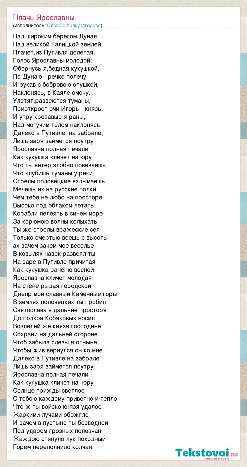 Над широким берегом Дуная, Над великой Галицкой землей Плачет,из Путивля долетая, Голос Ярославны молодой: Обернусь я,бедная,кукушкой, По Дунаю - речке полечу И рукав с бобровою опушкой, Наклонясь, в Каяле омочу. Улетят,развеются туманы, Приоткроет очи Игорь - князь, И утру кровавые я раны, Над могучим телом наклонясь. Далеко в Путивле, на забрале, Лишь заря займется поутру Ярославна полная печали Как кукушка кличет на юру Что ты ветер злобно повеваешь Что клубишь туманы у реки Стрелы половецкие вздымаешь Мечешь их на русские полки Чем тебе не любо на просторе Высоко под облаком летать Корабли лелеять в синем море За корюмою волны колыхать Ты же стрелы вражеские сея Только смертью веешь с высоты ах зачем зачем мое веселье В ковылях навек развеял ты На заре в Путивле причитая Как кукушка раненю весной Ярославна кличет молодая На стене рыдая городской Днепр мой славный Каменные горы В землях половецких ты пробил Святослава в дальние просторя До полкоа Кобяковых носил Возлелей же князя господине Сохрани на дальней стороне Чтоб забыла слезы я отныне Чтобы жив вернулся он ко мне Далеко в Путивле на забрале Лишь заря займется поутру Ярославна полная печали Как кукушка кличет на юру Солнце трижды светлое С тобою каждому приветно и тепло Что ж ты войско князя удалое Жаркими лучами обожгло И зачем в пустыне ты безводной Под ударом грозных половчан Жаждою стянуло лук походный Горем переполнило колчан.