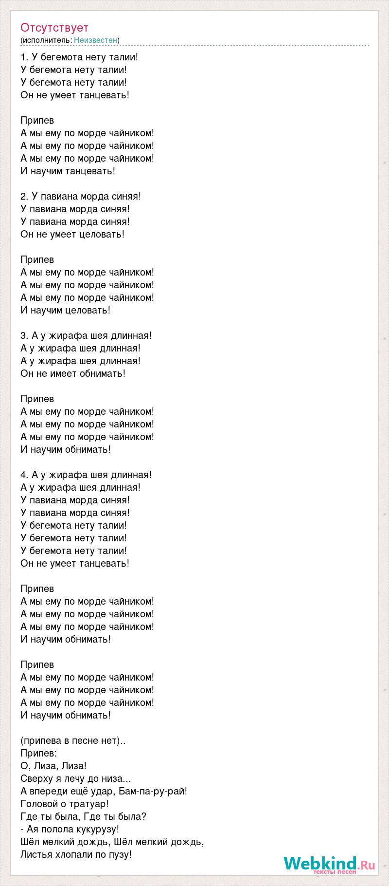 1. У бегемота нету талии! У бегемота нету талии! У бегемота нету талии! Он не умеет танцевать! Припев А мы ему по морде чайником! А мы ему по морде чайником! А мы ему по морде чайником! И научим танцевать! 2. У павиана морда синяя! У павиана морда синяя! У павиана морда синяя! Он не умеет целовать! Припев А мы ему по морде чайником! А мы ему по морде чайником! А мы ему по морде чайником! И научим целовать! 3. А у жирафа шея длинная! А у жирафа шея длинная! А у жирафа шея длинная! Он не имеет обнимать! Припев А мы ему по морде чайником! А мы ему по морде чайником! А мы ему по морде чайником! И научим обнимать! 4. А у жирафа шея длинная! А у жирафа шея длинная! У павиана морда синяя! У павиана морда синяя! У бегемота нету талии! У бегемота нету талии! У бегемота нету талии! Он не умеет танцевать! Припев А мы ему по морде чайником! А мы ему по морде чайником! А мы ему по морде чайником! И научим обнимать! Припев А мы ему по морде чайником! А мы ему по морде чайником! А мы ему по морде чайником! И научим обнимать! (припева в песне нет).. Припев: О, Лиза, Лиза! Сверху я лечу до низа... А впереди ещё удар, Бам-па-ру-рай! Головой о тратуар! Где ты была, Где ты была? - Ая полола кукурузу! Шёл мелкий дождь, Шёл мелкий дождь, Листья хлопали по пузу!