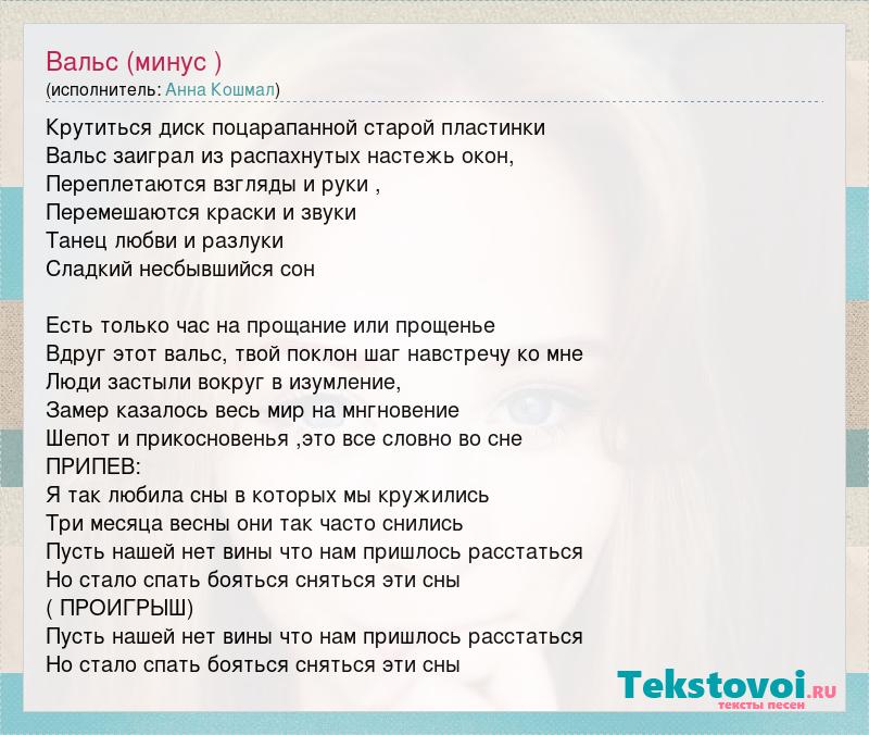 Крутиться диск поцарапанной старой пластинки Вальс заиграл из распахнутых настежь окон, Переплетаются взгляды и руки , Перемешаются краски и звуки Танец любви и разлуки Сладкий несбывшийся сон Есть только час на прощание или прощенье Вдруг этот вальс, твой поклон шаг навстречу ко мне Люди застыли вокруг в изумление, Замер казалось весь мир на мнгновение Шепот и прикосновенья ,это все словно во сне ПРИПЕВ: Я так любила сны в которых мы кружились Три месяца весны они так часто снились Пусть нашей нет вины что нам пришлось расстаться Но стало спать бояться сняться эти сны ( ПРОИГРЫШ) Пусть нашей нет вины что нам пришлось расстаться Но стало спать бояться сняться эти сны