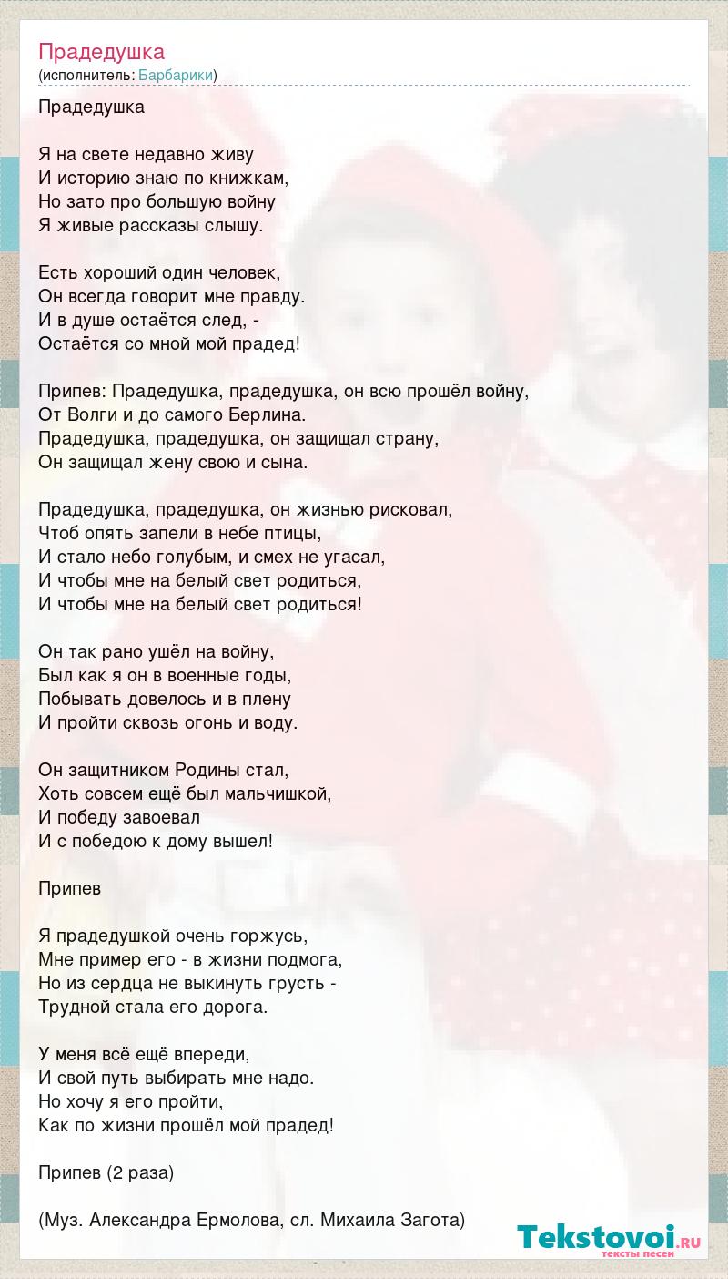 Прадедушка Я на свете недавно живу И историю знаю по книжкам, Но зато про большую войну Я живые рассказы слышу. Есть хороший один человек, Он всегда говорит мне правду. И в душе остаётся след, - Остаётся со мной мой прадед! Припев: Прадедушка, прадедушка, он всю прошёл войну, От Волги и до самого Берлина. Прадедушка, прадедушка, он защищал страну, Он защищал жену свою и сына. Прадедушка, прадедушка, он жизнью рисковал, Чтоб опять запели в небе птицы, И стало небо голубым, и смех не угасал, И чтобы мне на белый свет родиться, И чтобы мне на белый свет родиться! Он так рано ушёл на войну, Был как я он в военные годы, Побывать довелось и в плену И пройти сквозь огонь и воду. Он защитником Родины стал, Хоть совсем ещё был мальчишкой, И победу завоевал И с победою к дому вышел! Припев Я прадедушкой очень горжусь, Мне пример его - в жизни подмога, Но из сердца не выкинуть грусть - Трудной стала его дорога. У меня всё ещё впереди, И свой путь выбирать мне надо. Но хочу я его пройти, Как по жизни прошёл мой прадед! Припев (2 раза) (Муз. Александра Ермолова, сл. Михаила Загота)