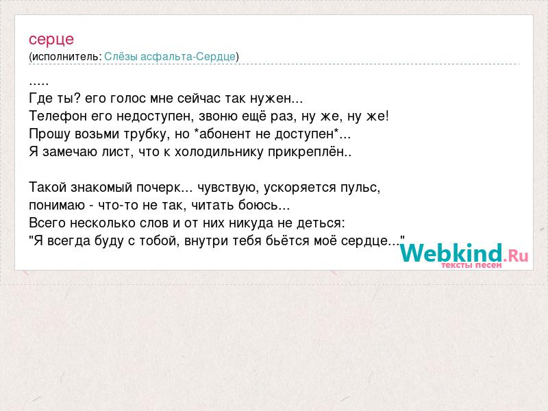 ..... Где ты? его голос мне сейчас так нужен... Телефон его недоступен, звоню ещё раз, ну же, ну же! Прошу возьми трубку, но *абонент не доступен*... Я замечаю лист, что к холодильнику прикреплён.. Такой знакомый почерк... чувствую, ускоряется пульс, понимаю - что-то не так, читать боюсь... Всего несколько слов и от них никуда не деться: "Я всегда буду с тобой, внутри тебя бьётся моё сердце..."
