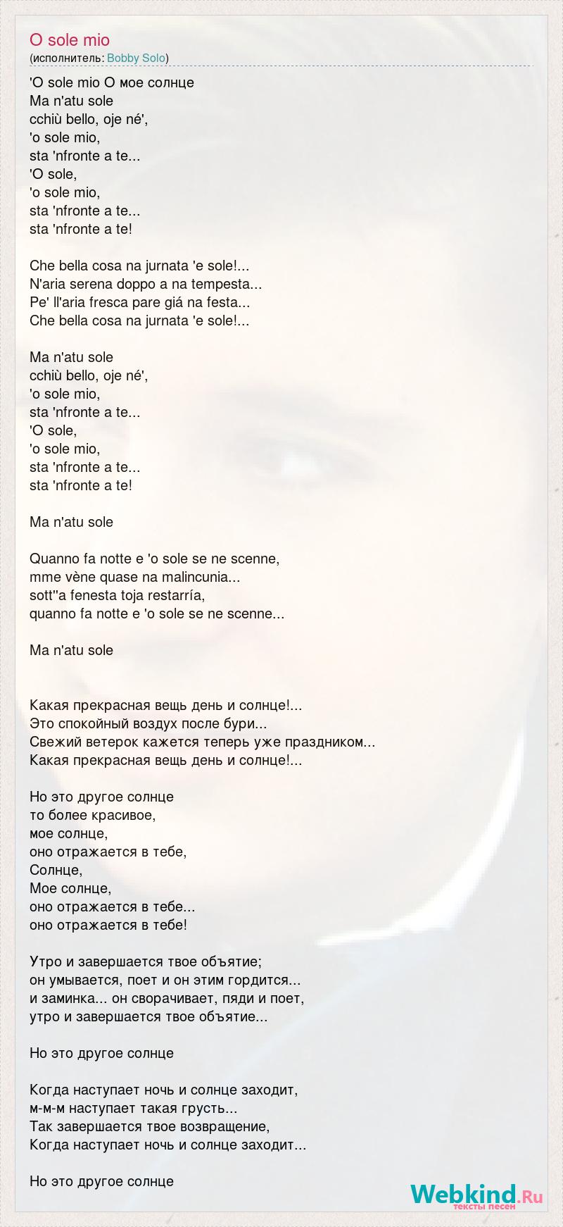 'O sole mio О мое солнце Ma n'atu sole cchiù bello, oje né', 'o sole mio, sta 'nfronte a te... 'O sole, 'o sole mio, sta 'nfronte a te... sta 'nfronte a te! Che bella cosa na jurnata 'e sole!... N'aria serena doppo a na tempesta... Pe' ll'aria fresca pare giá na festa... Che bella cosa na jurnata 'e sole!... Ma n'atu sole cchiù bello, oje né', 'o sole mio, sta 'nfronte a te... 'O sole, 'o sole mio, sta 'nfronte a te... sta 'nfronte a te! Ma n'atu sole Quanno fa notte e 'o sole se ne scenne, mme vène quase na malincunia... sott''a fenesta toja restarría, quanno fa notte e 'o sole se ne scenne... Ma n'atu sole Какая прекрасная вещь день и солнце!... Это спокойный воздух после бури... Свежий ветерок кажется теперь уже праздником... Какая прекрасная вещь день и солнце!... Но это другое солнце то более красивое, мое солнце, оно отражается в тебе, Солнце, Мое солнце, оно отражается в тебе... оно отражается в тебе! Утро и завершается твое объятие; он умывается, поет и он этим гордится... и заминка... он сворачивает, пяди и поет, утро и завершается твое объятие... Но это другое солнце Когда наступает ночь и солнце заходит, м-м-м наступает такая грусть... Так завершается твое возвращение, Когда наступает ночь и солнце заходит... Но это другое солнце