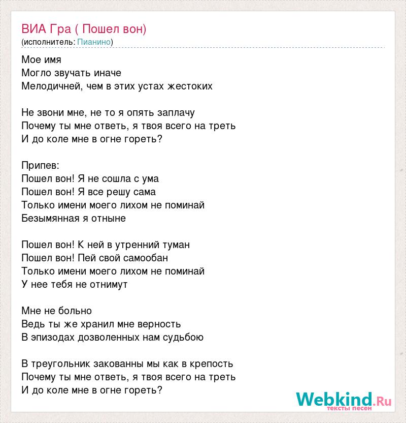 Мое имя Могло звучать иначе Мелодичней, чем в этих устах жестоких Не звони мне, не то я опять заплачу Почему ты мне ответь, я твоя всего на треть И до коле мне в огне гореть? Припев: Пошел вон! Я не сошла с ума Пошел вон! Я все решу сама Только имени моего лихом не поминай Безымянная я отныне Пошел вон! К ней в утренний туман Пошел вон! Пей свой самообан Только имени моего лихом не поминай У нее тебя не отнимут Мне не больно Ведь ты же хранил мне верность В эпизодах дозволенных нам судьбою В треугольник закованны мы как в крепость Почему ты мне ответь, я твоя всего на треть И до коле мне в огне гореть?
