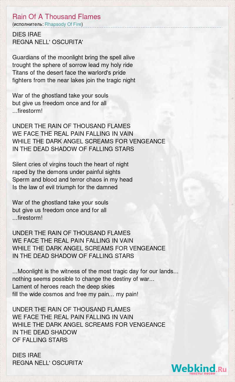 DIES IRAE REGNA NELL' OSCURITA' Guardians of the moonlight bring the spell alive trought the sphere of sorrow lead my holy ride Titans of the desert face the warlord's pride fighters from the near lakes join the tragic night War of the ghostland take your souls but give us freedom once and for all ...firestorm! UNDER THE RAIN OF THOUSAND FLAMES WE FACE THE REAL PAIN FALLING IN VAIN WHILE THE DARK ANGEL SCREAMS FOR VENGEANCE IN THE DEAD SHADOW OF FALLING STARS Silent cries of virgins touch the heart of night raped by the demons under painful sights Sperm and blood and terror chaos in my head Is the law of evil triumph for the damned War of the ghostland take your souls but give us freedom once and for all ...firestorm! UNDER THE RAIN OF THOUSAND FLAMES WE FACE THE REAL PAIN FALLING IN VAIN WHILE THE DARK ANGEL SCREAMS FOR VENGEANCE IN THE DEAD SHADOW OF FALLING STARS ...Moonlight is the witness of the most tragic day for our lands... nothing seems possible to change the destiny of war... Lament of heroes reach the deep skies fill the wide cosmos and free my pain... my pain! UNDER THE RAIN OF THOUSAND FLAMES WE FACE THE REAL PAIN FALLING IN VAIN WHILE THE DARK ANGEL SCREAMS FOR VENGEANCE IN THE DEAD SHADOW OF FALLING STARS DIES IRAE REGNA NELL' OSCURITA'